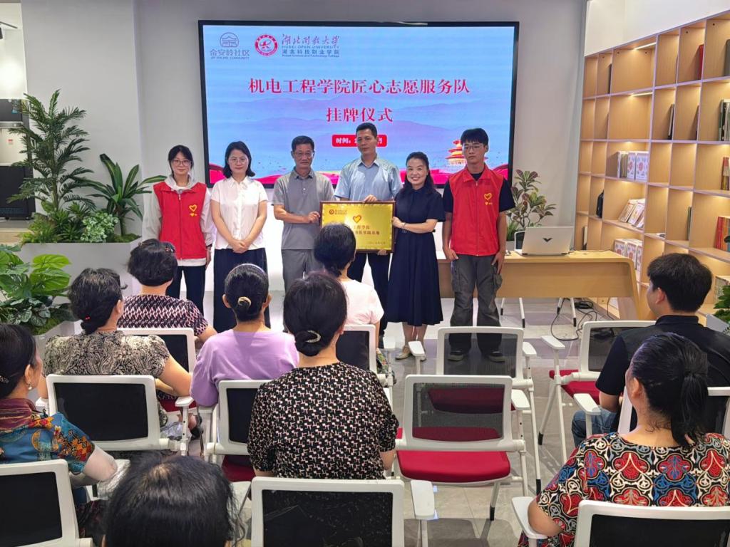 7月24日,机电工程学院党总支书记、教工一支部书记在金安岭社为社区授牌“湖北科技职业学院机电工程学院匠心志愿服务队实践基地”,金安岭社区书记陈静、宜昌市西陵区委社会工作部副部长谢登彪、夜明珠街道副主任张愉和共同出席仪式。学院党总支书记表示,此次是校社联动的生动实践,既发挥高校专业优势,又锤炼学生服务能力,未来将依托优质教育资源,与社区共丰居民生活、共建和谐社区。