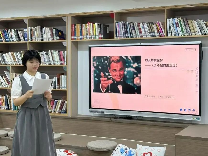 “梦想尽管躲避我们吧,无关紧要!明天,我们会跑得更快,伸展得更远,又将是一个晴朗的早晨。”杨圆同学首先分享了书籍《了不起的盖茨比》。该小说以尼克第一人称视角,讲述底层青年盖茨比在“爵士时代”下如何为人生奋斗的故事,其间穿插众人回忆,其中盖茨比与黛西的爱情尤为动人。