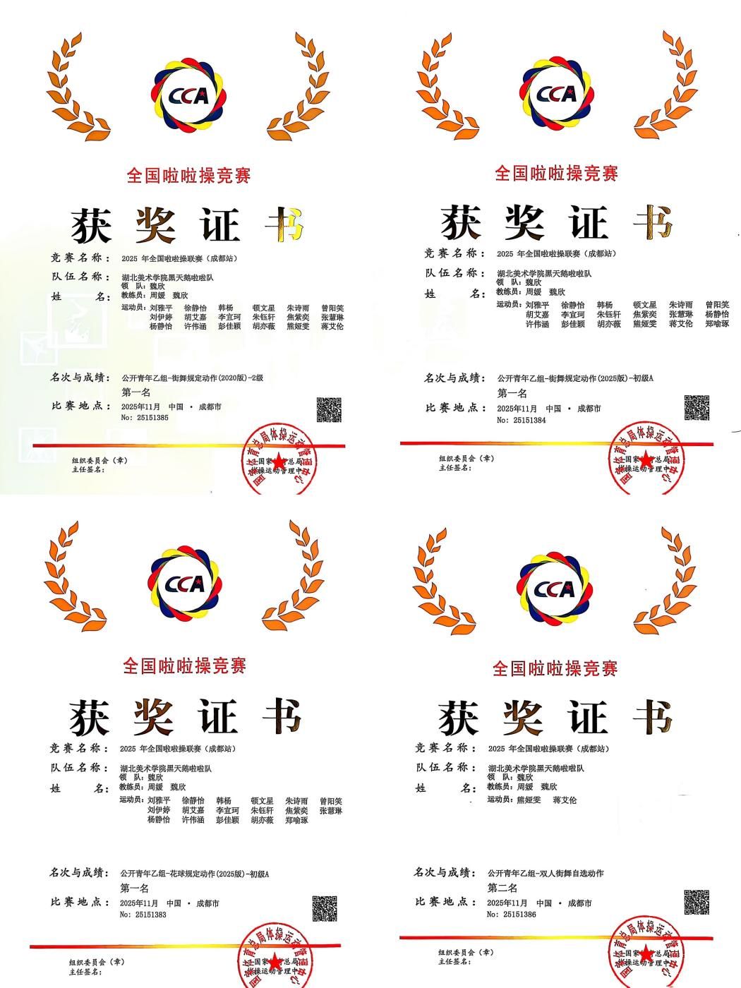 此次佳绩不仅是对队员们刻苦训练的最好回报,也充分展现了公共课部推进体育教学改革、培养通专融合高素质复合型美术人才的重要成果。队员们不仅是赛场上的佼佼者,更是校园文化的传播者和青春正能量的代言人。未来,黑天鹅啦啦操队将继续以青春之名,追光而行,在更多赛场上绽放属于湖美学子的独特光彩!