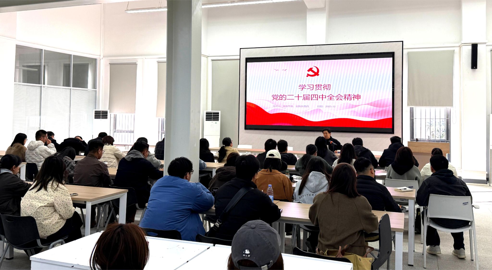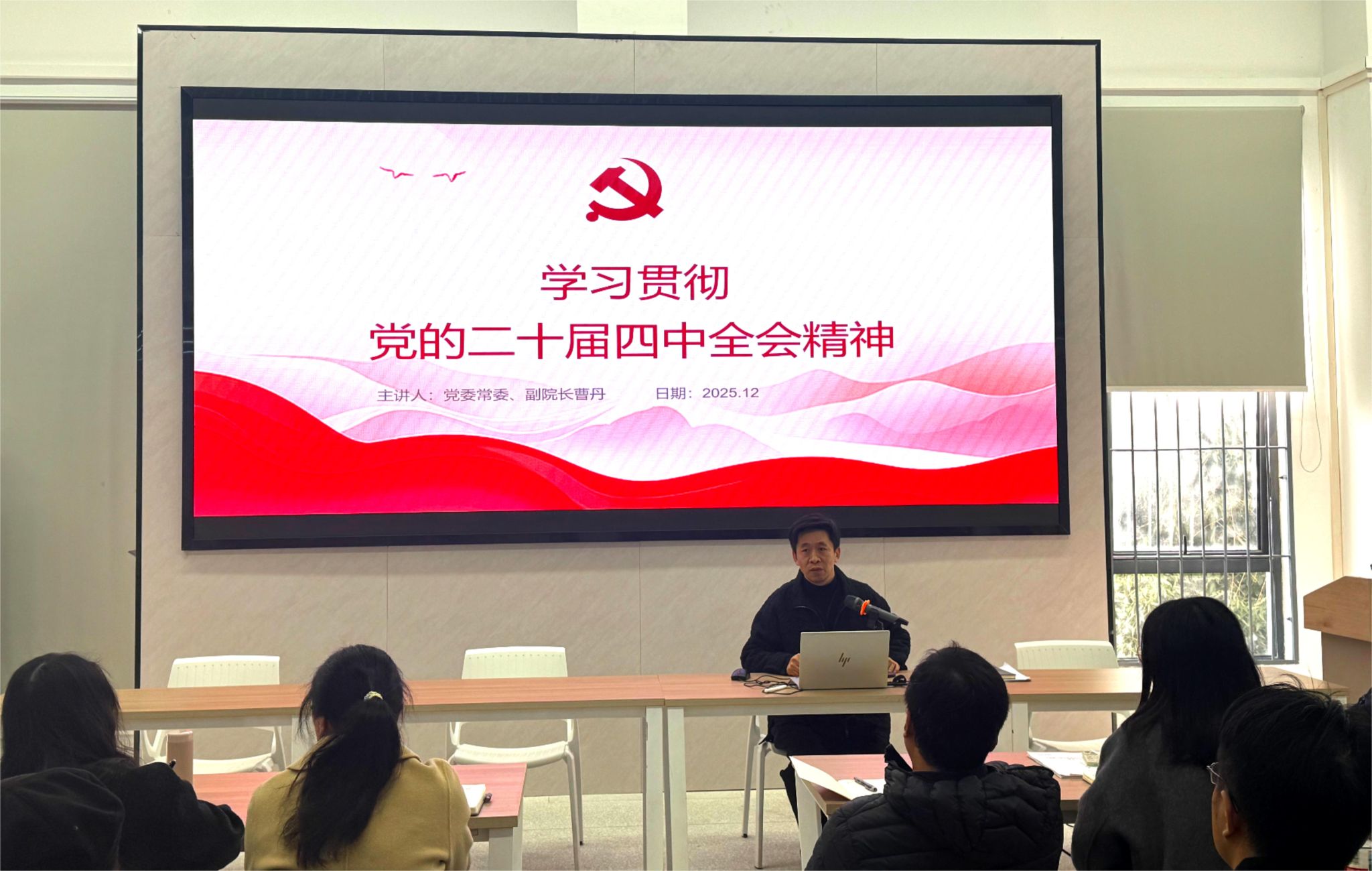 12月3日上午,党委常委、副校长曹丹宣讲党的二十届四中全会精神。工业设计学院全体教职工、学生代表在A6教学楼209报告厅听取宣讲报告。