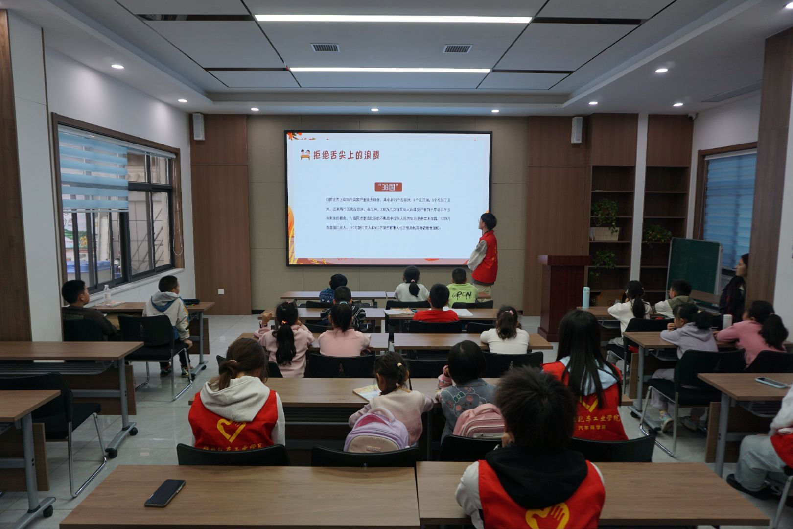 为迎接世界粮食日的到来,10月19日,汽车商学院组织大学生志愿者走进王湾社区,开展了以“节约粮食、杜绝浪费”为主题的公益宣讲活动,引导孩子们从小树立节约意识,理解粮食的来之不易。