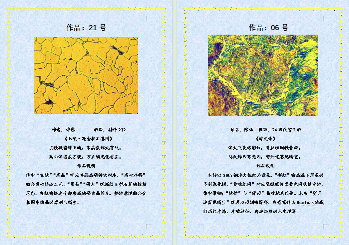 活动负责人表示:“引导学生从实验数据里感悟结构蕴含的力量与创造的神奇,这本身就是极具意义的教育过程。”在实际操作中,当学生为展现出韧性的金相图配上“千磨万击还坚劲”的诗句时,坚韧不拔的品格便如春雨般悄然滋润着他们的心田;当面对致密如金刚石的微观组织吟出“宝剑锋从磨砺出”时,艰苦奋斗的精神便与专业知识产生了深度共鸣。这一过程,正是美育与思政教育“随风潜入夜,润物细无声”的生动写照。通过学科交叉的创作形式,学生不仅深化了对专业知识的理解,更提升了审美素养,激发了对中华优秀传统文化的热爱,从而在文化自信中筑牢价值基石。
