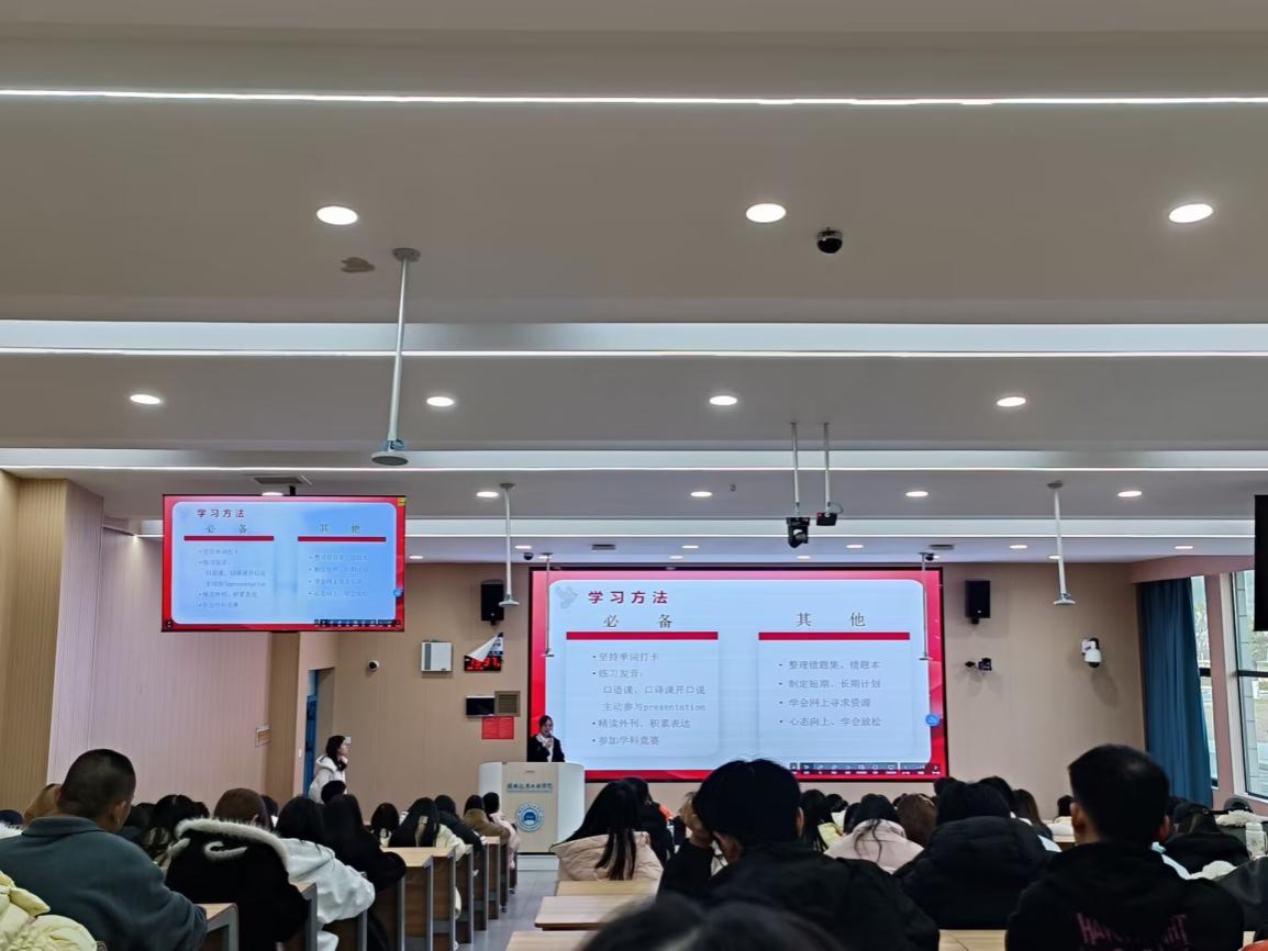 会上,获奖学生结合自身专业特色与求学经历,围绕学习经验技巧、相关竞赛实战策略、大学四年规划逻辑等方面带来针对性满满的干货。翻译231彭可分享翻译练习技巧与译文优化技巧,拆解翻译能力进阶路径;英语224胡恩琦梳理专四备考规划与高效学习方法,分享学科竞赛备赛经验与时间管理技巧;国贸222丁凤灵解读职业方向探索思路与实践资源对接方法,强调“持续积累”与“明确目标”的重要性。