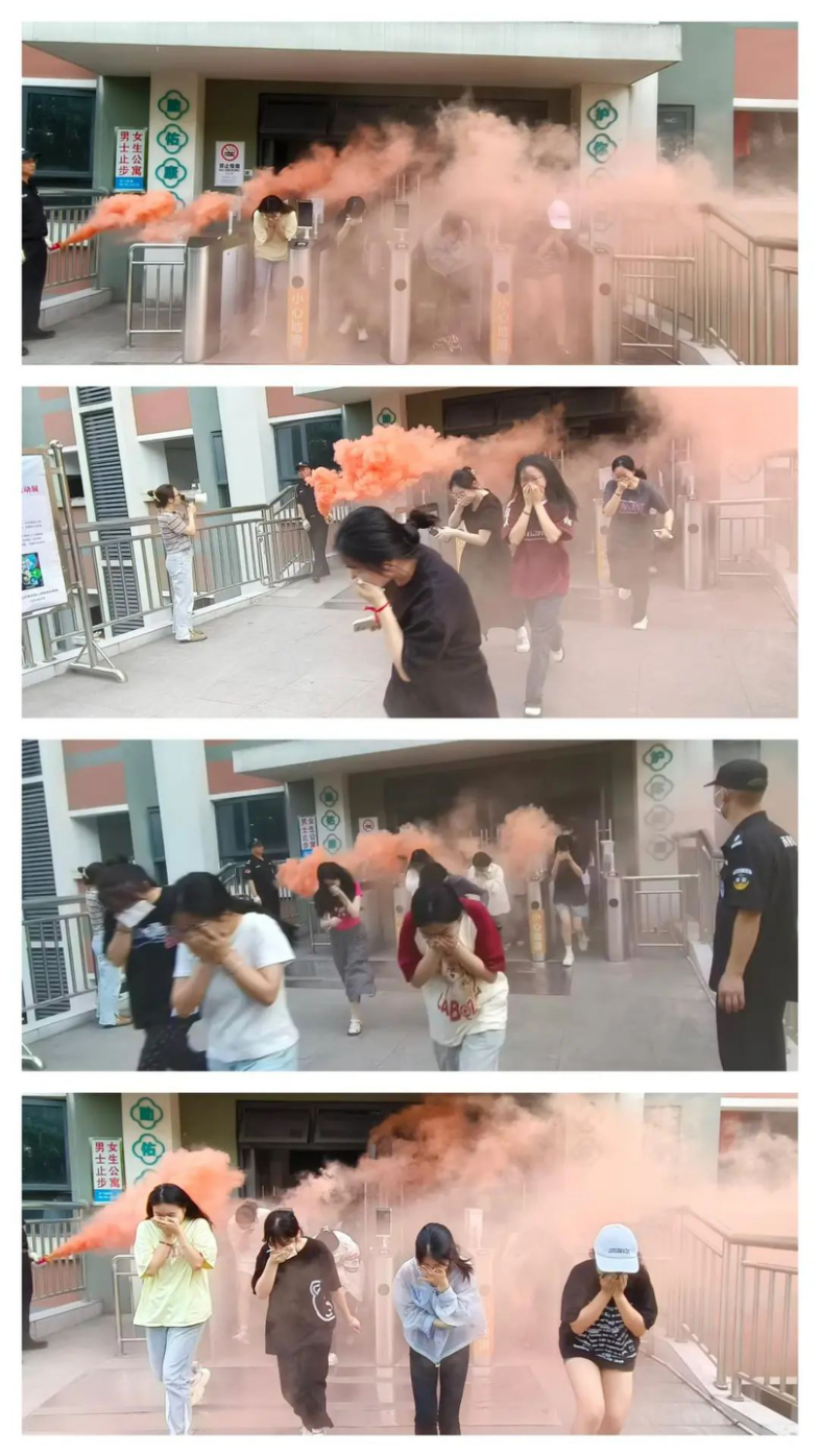 伴随着“浓烟”乍起,急促的火警铃响起,演练正式拉开帷幕。社区辅导员、学生干部迅速到达指定位置,根据消防疏散预案有序组织,确保楼内学生安全撤离至空旷区域。学生们捂住口鼻,低头,弯腰,靠墙快速撤离,全程严肃安静,井然有序。