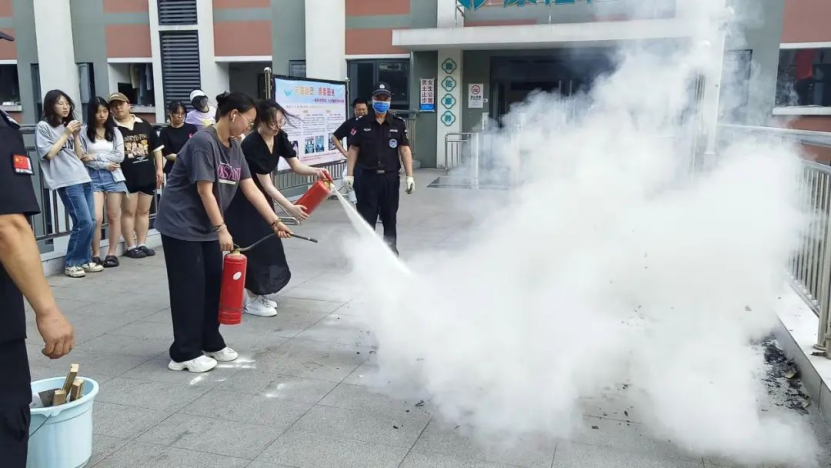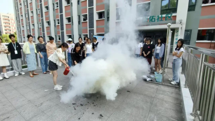 演练结束后,后保处老师对逃生演练进行全方位点评,并开展消防安全培训。培训中,工作人员带领大家了解消防器材和干粉灭火器的使用方法,在现场进行模拟实训,社区师生“零距离”体验灭火,进一步巩固了灭火器的正确使用方法。
