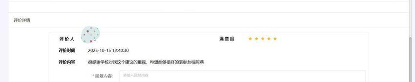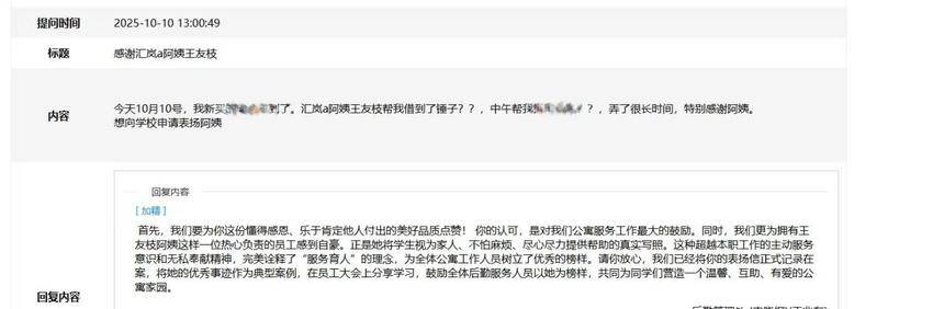 10月10日,张同学(化名)正在组装东西时,面对复杂的螺丝和部件慌了手脚,正在他一筹莫展时,宿管阿姨王友枝走了过来。她看到张同学的困境,便帮他借到了工具。“中午帮我拆卸零件,弄了很长时间,特别感谢阿姨。”张同学(化名)在“学生诉求快速响应系统”中写道。这份感激之情,不仅是对王阿姨个人的认可,更是对学校服务育人工作的肯定。