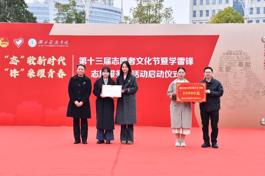 爱心汇聚,善行传递。在捐赠环节,我校“杏林文创”学生创业团队向“湖医药好人基金”捐赠善款2万元,用于支持校园公益事业。党委宣传部副部长陈旭代表学校接受捐赠,教育发展基金会牛佳副处长为团队颁发捐赠证书。