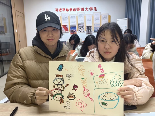 本次活动分为绘画创作与主题观影两个环节。在绘画创作环节,同学们以两人为一组,围绕冬至主题展开创作。作品创意纷呈:既有雪人、雪花构成的冬日图景,也有融合福字窗花、建筑简笔与汤圆图案的专业创作,还有描绘家庭团聚场景的温馨画面。同学们的一幅幅画作成为传承冬至文化的生动载体。