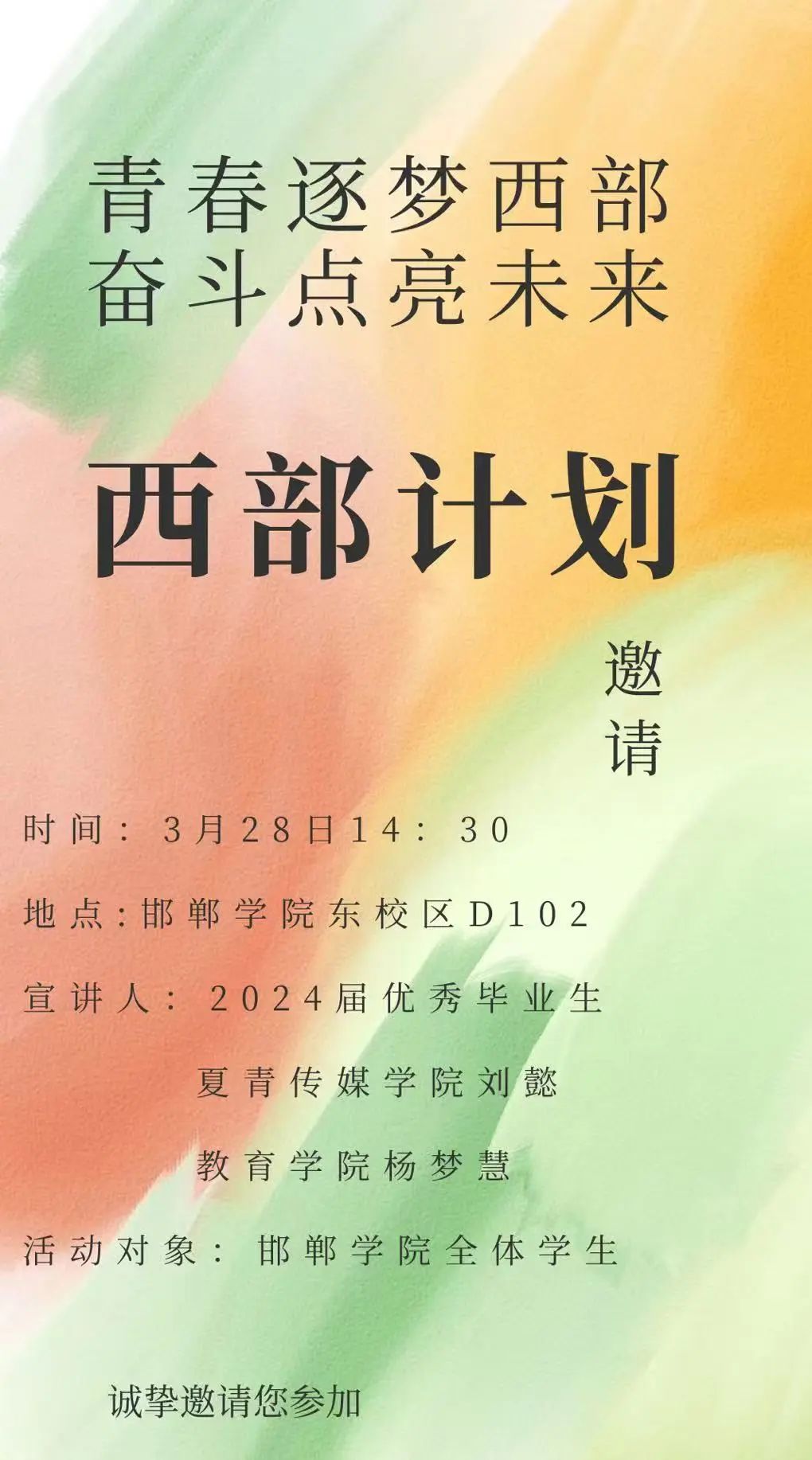 为深入贯彻落实党中央关于引导高校毕业生到基层工作、助力西部大开发战略的重要指示精神,进一步加大大学生志愿服务西部计划的宣传与招募力度,2025年3月28日,夏青传媒学院在主校区D201开展西部计划宣讲活动,夏青传媒学院2024届播音与主持艺术专业优秀毕业生刘懿与教育学院2024届学前教育专业优秀毕业生杨梦慧,充分发挥学科交叉优势,创新开展2024年大学生志愿服务西部计划系列宣讲活动。通过宣讲会、成长经验分享沙龙、线上直播答疑、实践案例展演等多元形式,构建起“理论阐释+实践指导+朋辈示范”的立体化宣介模式,精准对接学生职业发展需求,激发青年学子投身西部建设的报国热情。