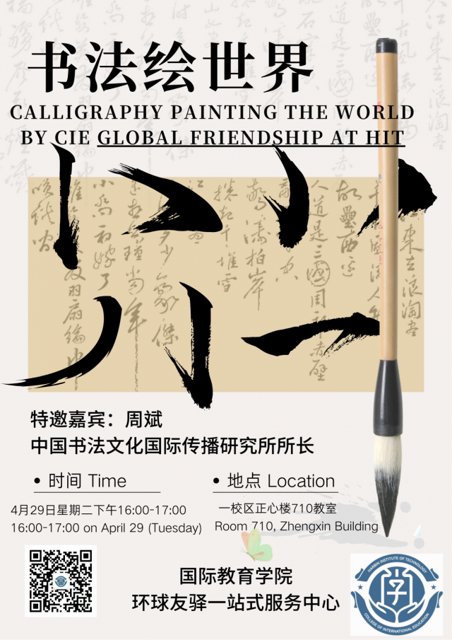 In order to further enhance international students’ interests in traditional Chinese culture, promote the excellent Chinese calligraphy culture and enrich students’ campus life, the “Global Friendship at HIT” One-stop Service Center of the College of International Education , in conjunction with Faculty of Humanities and Social Sciences, has specially launched a series of activities to experience the excellent traditional Chinese cultures. The theme of this issue is “Calligraphy Painting the World”, and the well-known calligrapher Dr. ZHOU Bin is invited to guide you to appreciate the unique charm of Chinese calligraphy and feel the cultural philosophy between brush pen and ink.