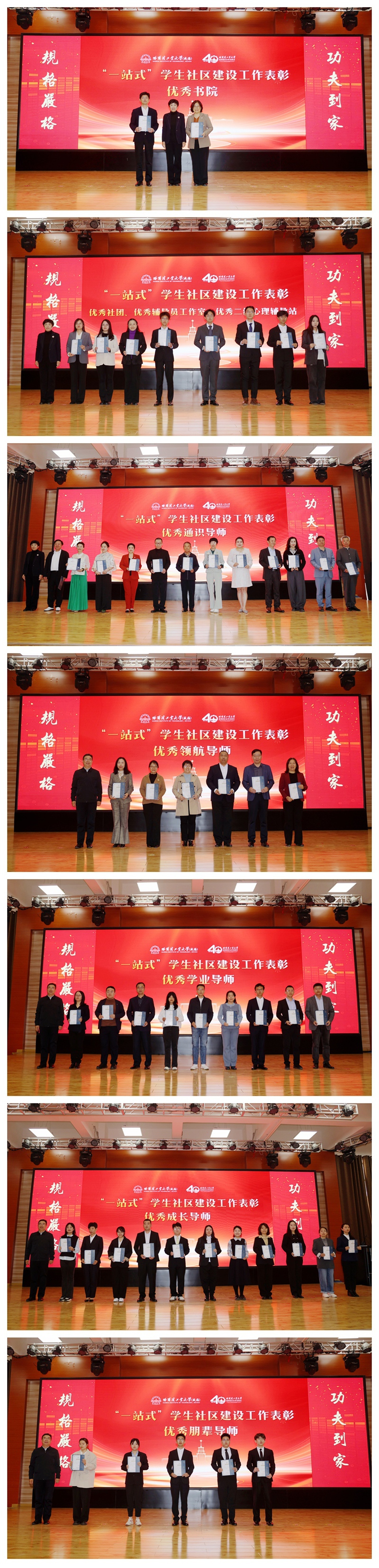 4月27日,哈尔滨工业大学(威海)2025年示范“一站式”学生社区建设工作推进会在大学生活动中心多功能厅召开。校区党委书记张淑娣出席会议并讲话。校区党委副书记、副校长赵国亮部署校区《示范“一站式”学生社区示范建设和宣传展示工作方案》(以下简称《方案》)。张淑娣、赵国亮分别为“一站式”学生社区优秀领航导师、学业导师、成长导师、朋辈导师、通识导师代表和优秀组织、书院颁奖。