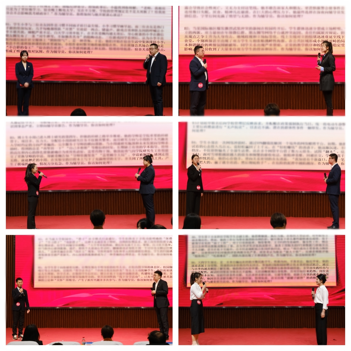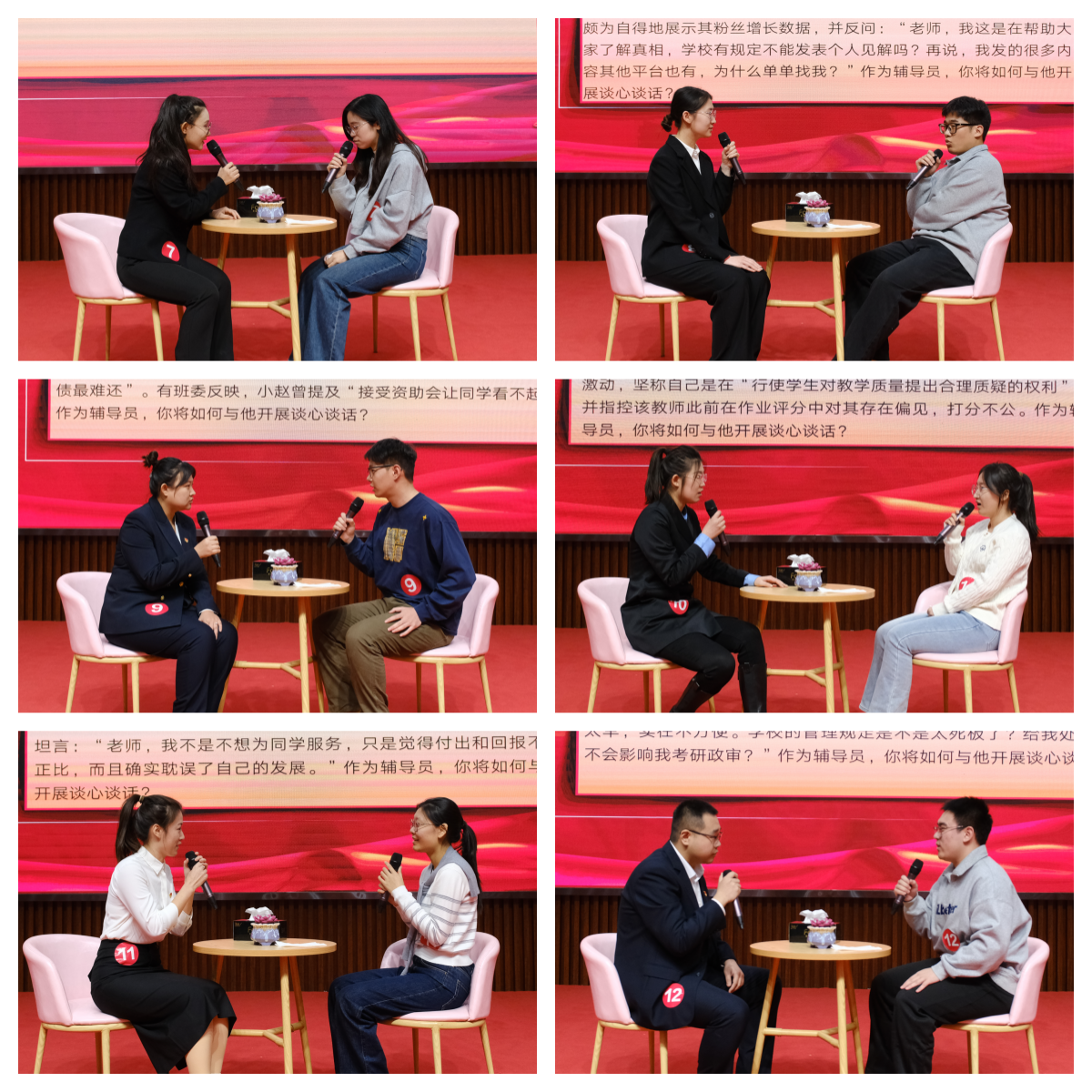 大赛分为初赛和复赛两个阶段,经过初赛的业务知识考试与学生信息辨识环节,12名辅导员脱颖而出成功晋级决赛。决赛分为谈心谈话和案例研讨两个环节。