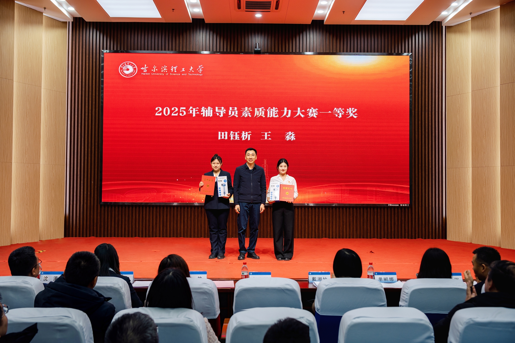 学校党委副书记赵水杉为获得2025年度辅导员素质能力大赛一等奖的参赛选手颁奖
