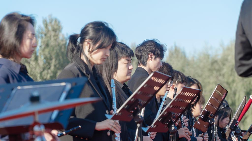学生管乐团在管弦系青年教师刘殿栋的指挥下演奏的《我爱你中国》,表达了对伟大祖国的热爱和祝福。