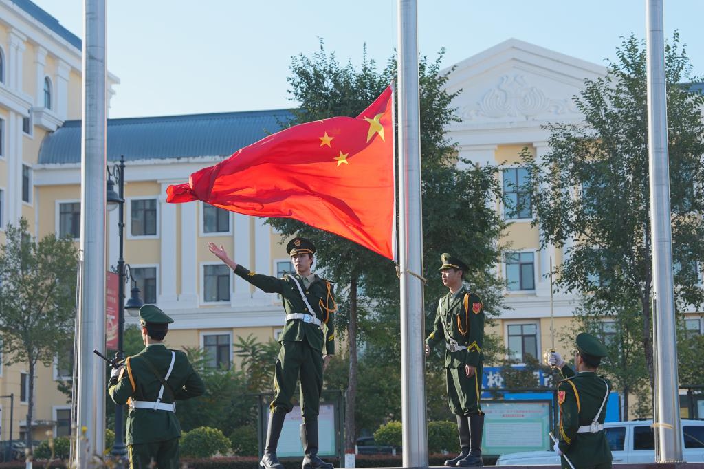 伴随学生管乐团演奏的庄严国歌,鲜艳的五星红旗在清晨的阳光中冉冉升起。