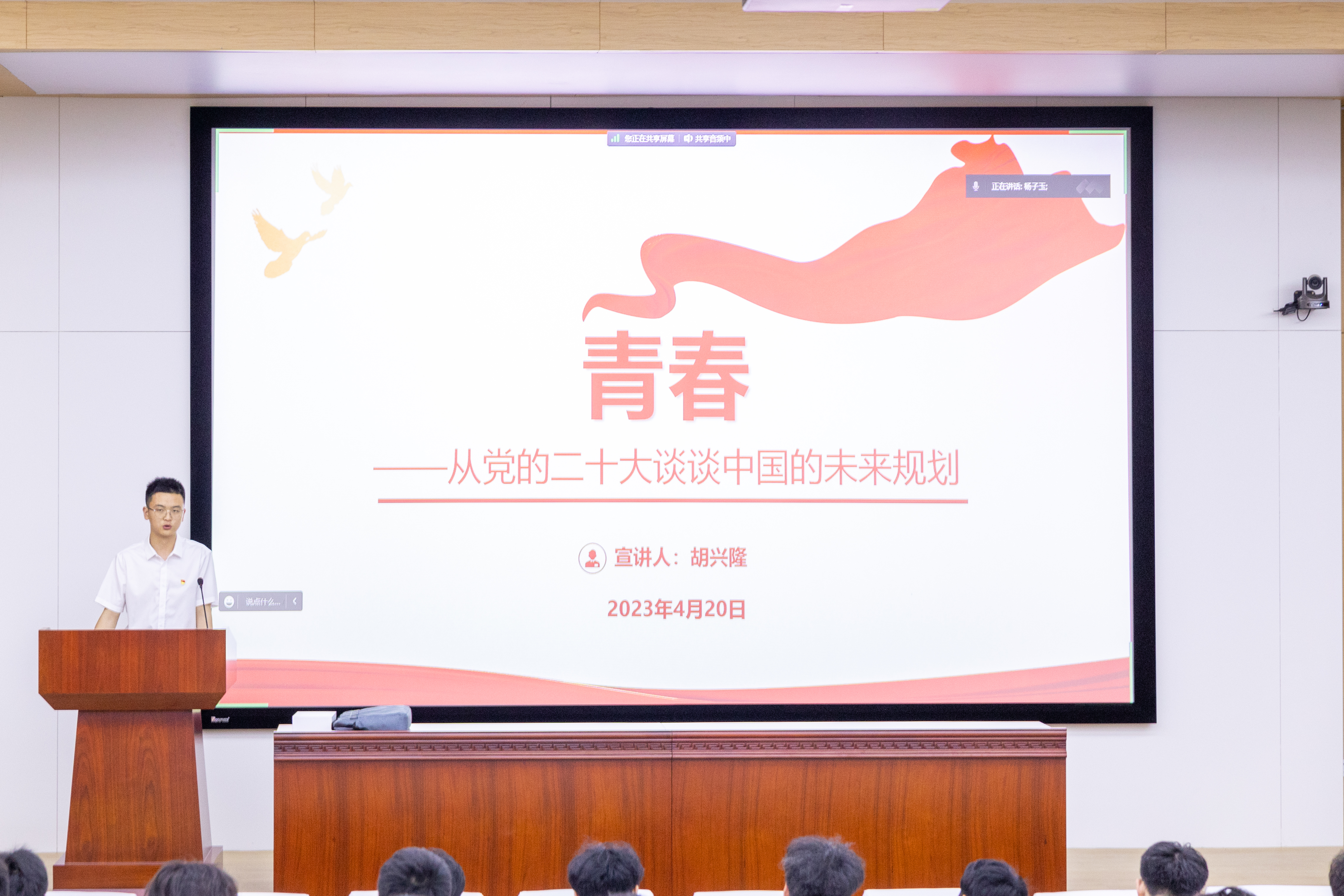 胡兴隆同学以《青春——从党的二十大谈谈中国的未来规划》为题向同学们做宣讲,他从文武中国、中国大同、青春之我三个角度围绕文化自信、人民民主、国防军队、和平发展、科教兴国等方面进行阐述,引经典、举事例、摆数据,从所学专业出发,引导学生学习党史国史,充分认识党走过的百年辉煌征程,用伟大奋斗创造的百年伟业,用新的伟大奋斗创造新的伟业,深刻理解中国式现代化的的宏伟蓝图,激励斛兵学子勇毅前行,担当作为,以青春之我,助力伟大复兴。