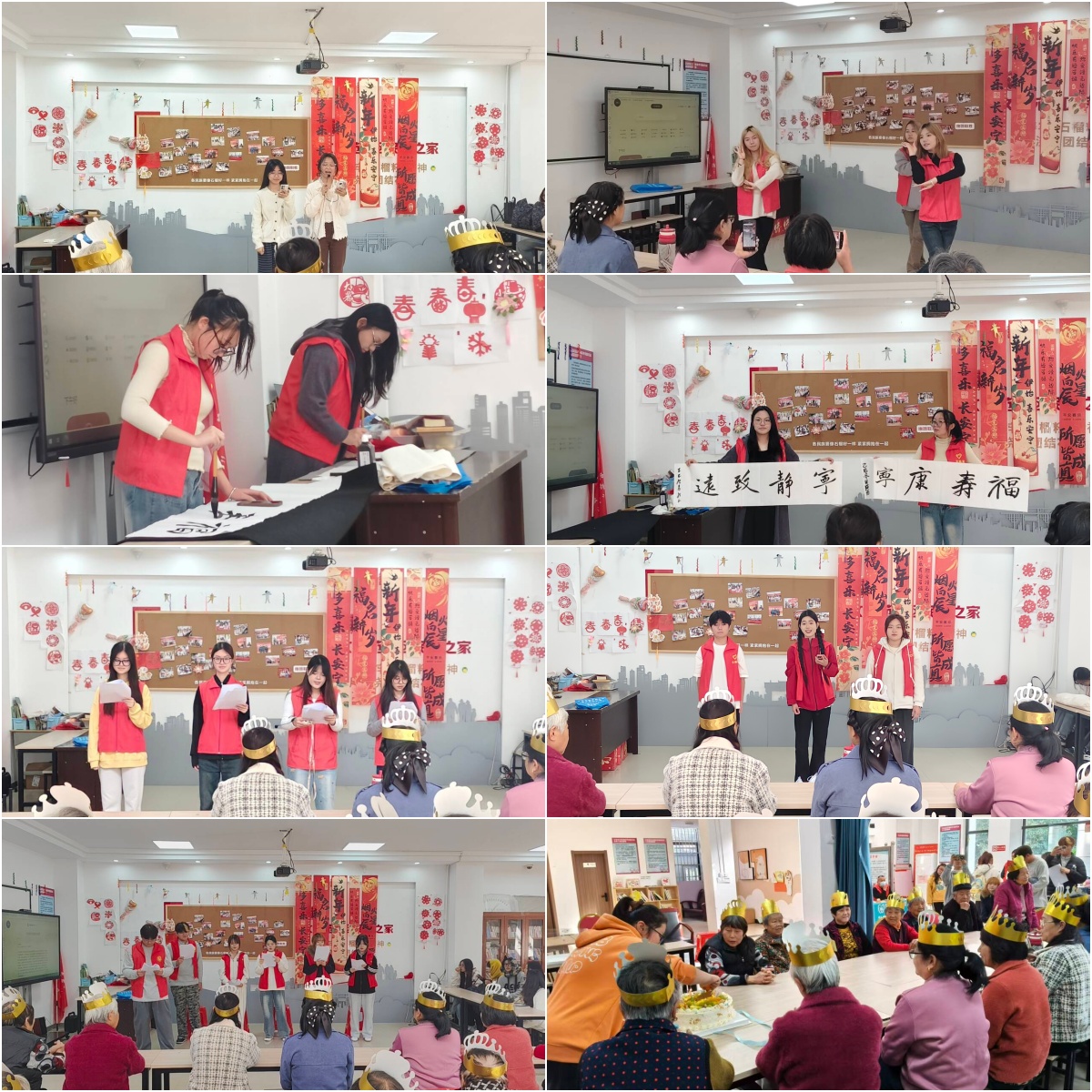 活动现场暖意融融,文艺表演精彩纷呈。舞蹈《小船摇》灵动的舞姿如微风拂过湖面,尽显青春活力,赢得在场老人阵阵掌声。书法表演《墨韵》中,志愿者挥毫泼墨,“福寿安康”等笔墨飘香的作品,传递着对社区居民的美好祝愿。朗诵《愿雪色成春色》情感真挚,传递出对生活的热爱与美好期许。歌曲《我和我的祖国》旋律昂扬,师生与居民同声合唱,爱国情怀在歌声中激荡。