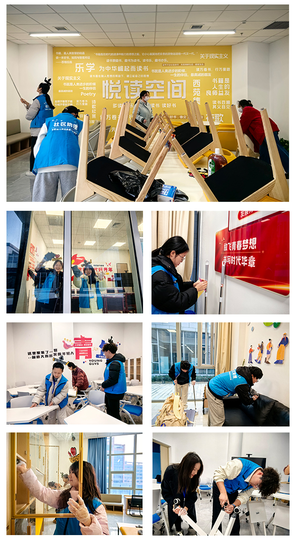 活动伊始,同学们组成“劳动小分队”,领取任务卡与清洁工具后,分组前往社区各功能室、服务大厅、公共走廊等区域,开展全方位清扫整理。大家各司其职、配合默契,有人细致擦拭桌椅窗台,不放过任何角落;有人反复拖洗地面,让瓷砖光洁如新;有人整理宣传资料,归类收纳整齐;还有人清理卫生死角,扫除蛛网杂物。一扫一擦之间,社区环境焕然一新,劳动教育的价值在点滴汗水中得以滋养与彰显。