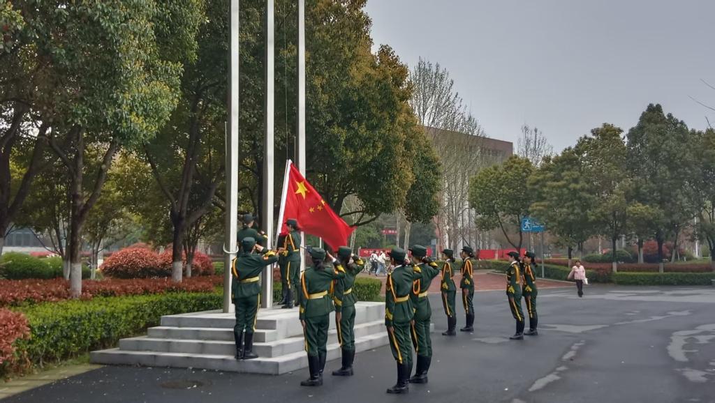 伴随着雄壮嘹亮的《义勇军进行曲》奏响,全场师生肃立注目,神情庄重。在慷慨激昂的旋律中,鲜艳的五星红旗在晨光中冉冉升起,迎风飘扬。师生们目光紧随徐徐上升的国旗,心中激荡着对祖国的无限热爱与崇高敬意,现场气氛庄严而热烈。