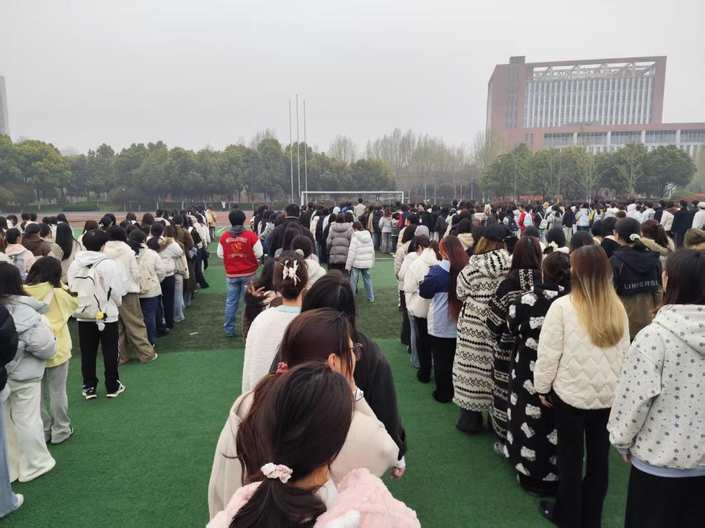 操场上,各班列队整齐、横纵成线,全体师生精神饱满、神情庄重。国旗护卫队队员身着统一制服,迈着铿锵有力、整齐划一的步伐,昂首挺胸护送五星红旗稳步走向升旗台。队员们身姿挺拔如松,目光坚定如炬,每一步都踏出青春的力量,每一声都回荡在清晨的校园,尽显艺术系学子昂扬向上的精神风貌。