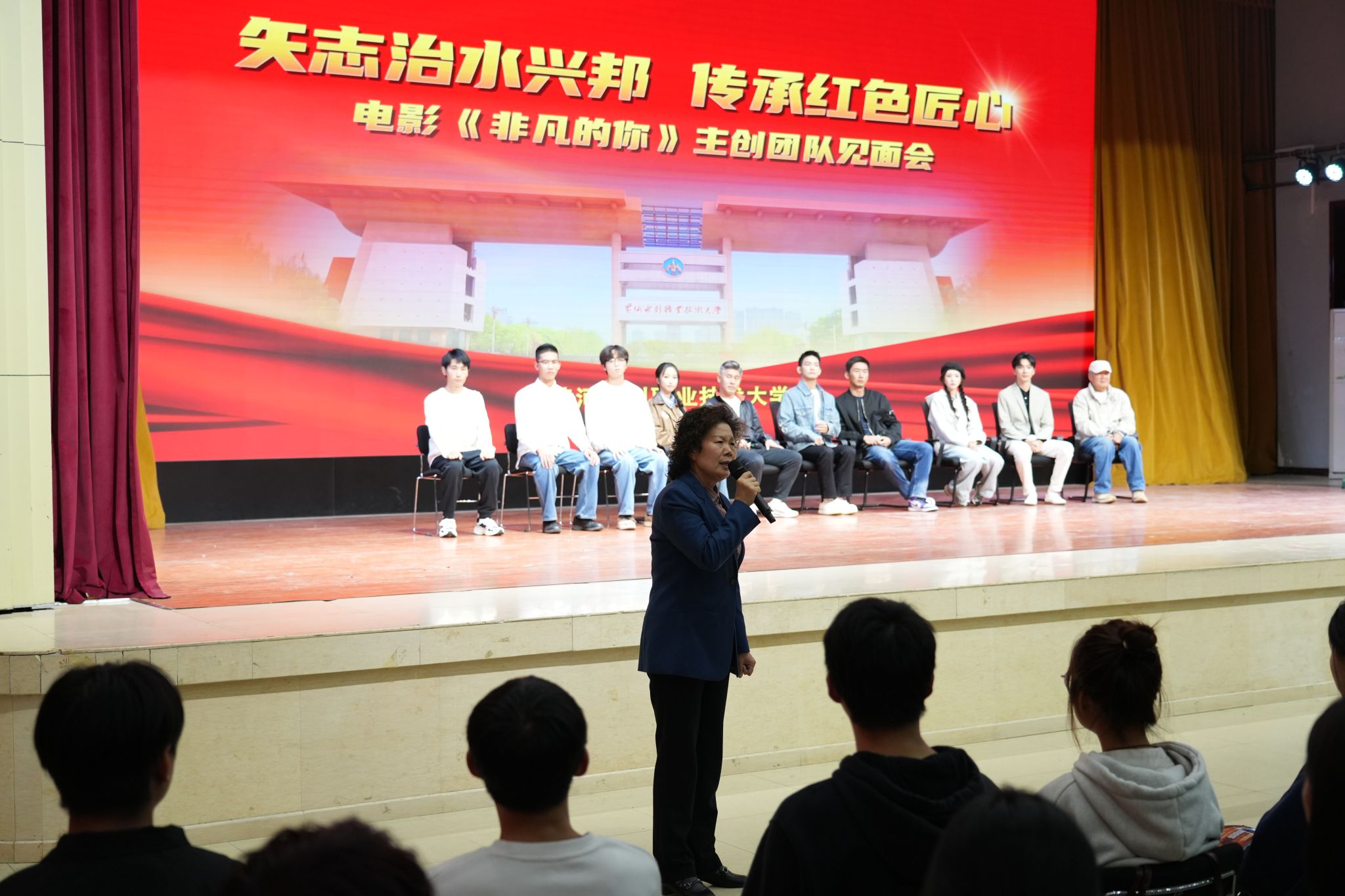 周保平在讲话中指出,学校始终牢记习近平总书记的殷殷嘱托,用心传承好红旗渠精神,坚持把学生精神品格的塑造放在育人工作重要位置,把“立德树人”根本任务落到实处,努力培养更多能扛住艰苦、担起使命的“非凡”水利人才。在学校高质量发展的征程中,一代代黄水人坚守攻坚克难的担当精神、精益求精的工匠精神和甘于奉献的家国情怀,以初心赴使命,以实干显担当。周保平代表学校向电影《非凡的你》主创团队表示诚挚感谢,她强调,主创团队将我校杰出校友吴祖泰的感人事迹搬上银幕,把一段深植于学校血脉中的感人故事,生动地呈现在师生面前,这不仅仅是一次艺术展现,更是一堂鲜活、深刻、极具影响力的“大思政课”,必将点燃师生的精神之火,汇聚成砥砺前行的磅礴力量。她号召全体师生以红旗渠精神为动力,以吴祖泰等杰出校友为榜样,在技能报国的征程中勇担使命,争做新时代卓越“答卷人”。