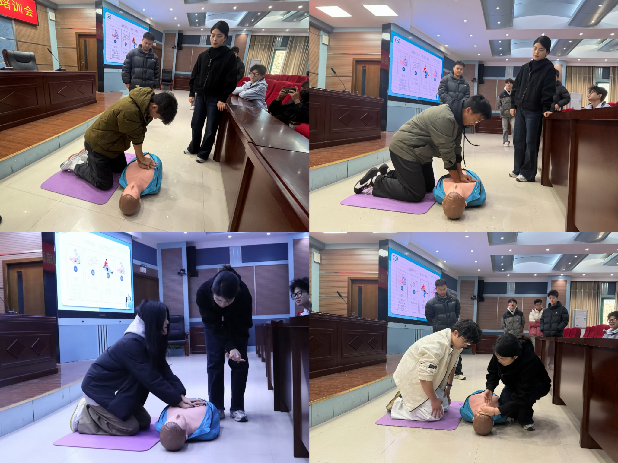 培训由后勤管理服务中心马祎琛老师主讲,以“守护生命,‘救’在身边”为主题,重点讲解了心肺复苏(CPR)与海姆立克急救法的相关知识。培训中强调了“黄金救援4分钟”的重要性,演示了心肺复苏中判断生命体征、胸外按压、开放气道和人工呼吸等关键步骤,并指出操作注意事项。在讲解海姆立克急救法时,马祎琛通过现场情景模拟,生动演示了针对成人气道异物梗阻的标准处理方式,深入剖析“生命的拥抱”这一急救技巧的动作要领与适用情形。随后,部分同学参加模拟演练,深化了对急救知识的理解,逐步建立起在突发状况下实施初步救援的信心与能力。