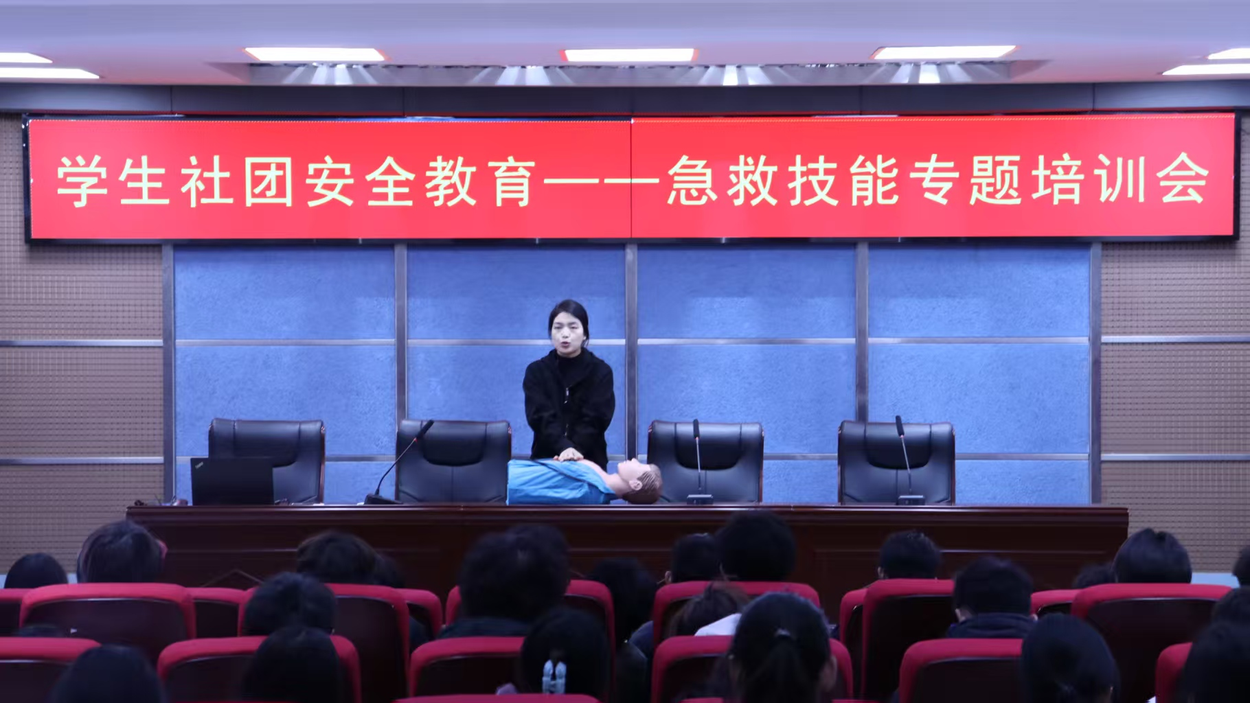 为全面筑牢校园安全防线,切实增强学生社团骨干的应急救护与风险防范能力,11月18日,学校在三号实训馆学术报告厅召开学生社团安全教育急救技能专题培训会。全体学生社团负责同学参加本次培训。