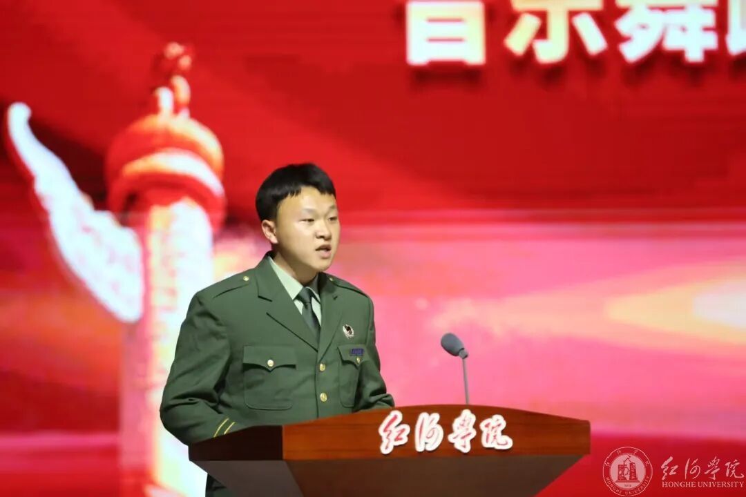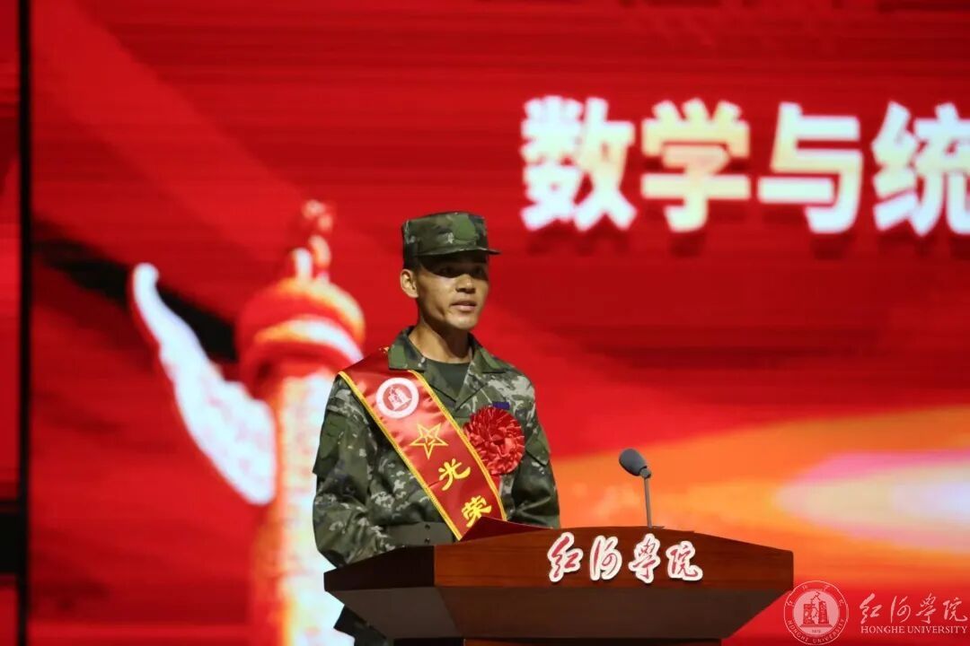 音乐舞蹈学院支晨竹作为退役学生代表发言,分享了军营锤炼的成长经历,勉励新兵们不负韶华、不负使命。数学与统计学院毕业生李载作为新兵代表庄严承诺:必以过硬本领报效祖国,为母校争光!