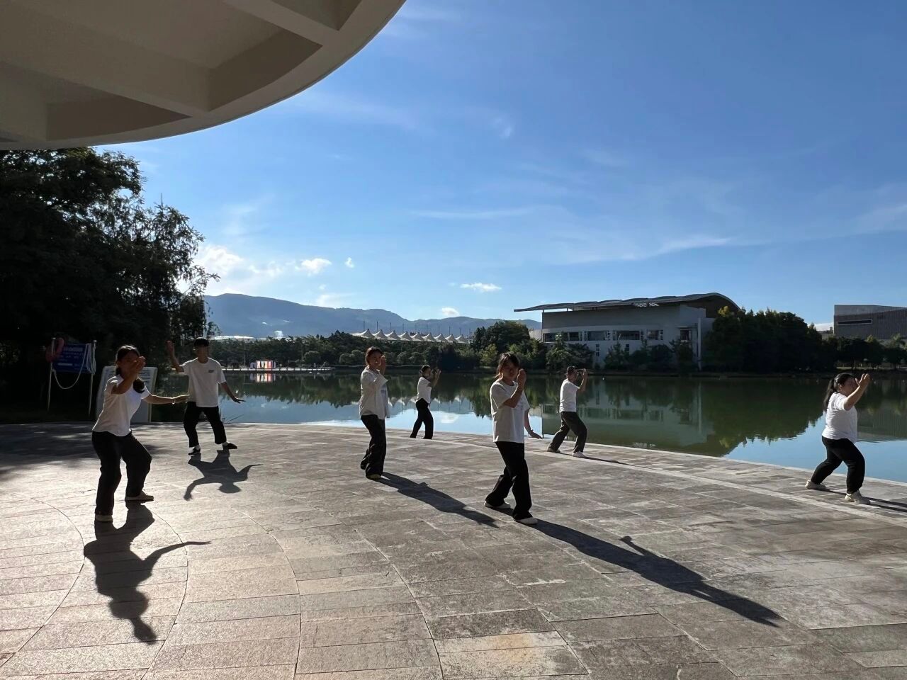 长廊中心小广场,太极拳协会成员以一段《松柔功操》惊艳亮相,动作行云流水、刚柔并济,在一静一动间诠释太极智慧,也启示着奔跑的学子们在途中戒骄戒躁、稳中求进。