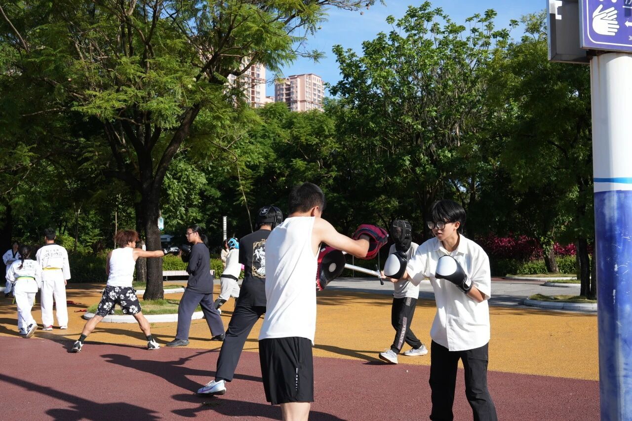 南大门彩色广场前,跆拳道社团学子身着洁白道服,踢腿凌厉有力,尽显武者风范;散打社成员在红蓝护具的映衬下,将“以快制巧,以刚克柔”的格斗智慧融入一招一式,出击迅猛、防御稳健,显现青年一代昂扬气势。
