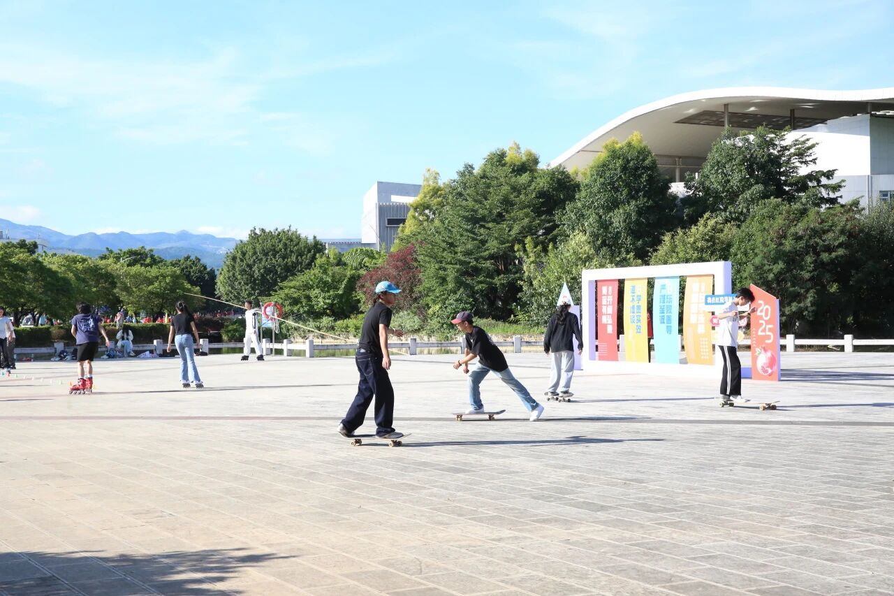 有鸣潭广场上,轮滑社成员上演精彩的“圈圈拼接”表演,轮滑鞋在地面划出灵动弧线,队员间的默契配合尽显青春活力,动感姿态展现青年蓬勃朝气。