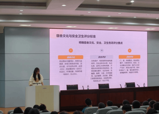 会议第三项议程为业务培训,学生社区自我管理与服务协会会长李晓榕介绍了协会各部门构成情况和主要工作职责,同时围绕《红河学院学生公寓(宿舍)卫生评比细则》,对协会会员和各级网格员如何开展学生社区日常管理工作进行了业务培训。