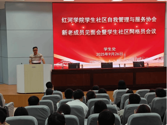 9月26日晚19:00,红河学院学生社区自我管理与服务协会新老成员见面会暨学生社区网格员会议在文鼎楼二楼报告厅举行。会议由学生社区自我管理与服务协会副会长徐小榆主持,学生处学生中心主任柳永禄老师、杨洁、黄庭玺老师,学生宿舍园区管理员、各园区楼栋长、楼层长及学生社区自我管理与服务协会全体新老成员参加。