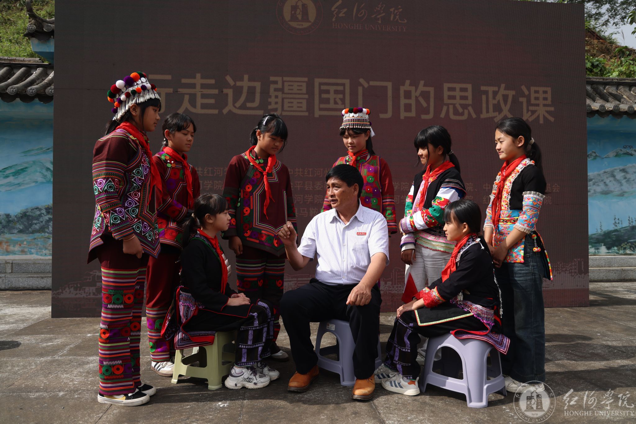 赵汝杰主持“行走边疆国门的思政课”,红河学院二级教授、云南省文史研究馆馆员、“云南好人”杨六金以“读书改变人生,知识改变命运”为主题面向马鞍底乡中小学生进行了宣讲。他结合自身成长经历与学术研究,分享个人在党和国家关怀下从辍学放牛娃成长为大学教授的奋斗故事,讲述各民族团结互助、铸牢中华民族共同体意识的历程,鼓励师生树立理想、珍惜时光,将“小我”融入国家发展“大我”。