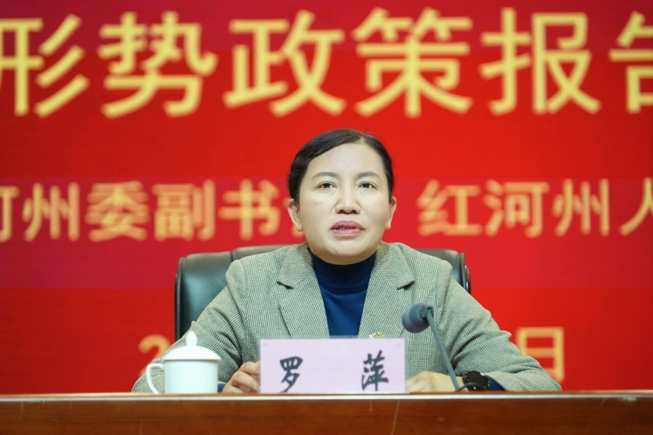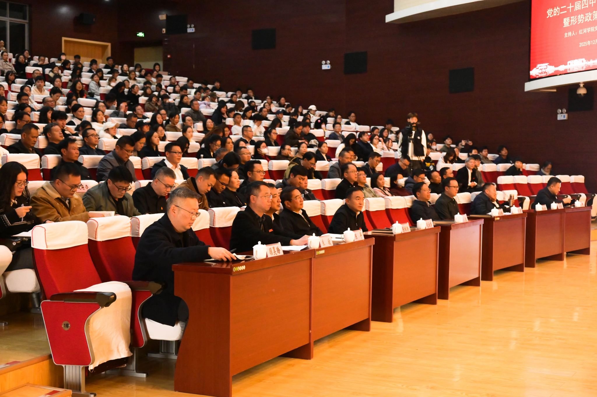 为推动党的二十届四中全会精神落地生根、转化为服务地方发展的实践动能,12月1日下午,红河学院在学生活动中心举办党的二十届四中全会精神宣讲暨形势政策报告会。中共红河州委副书记、红河州人民政府州长罗萍受邀主讲,师生代表齐聚现场,共学全会精神、共绘校地发展蓝图。报告会由红河学院党委书记洪波主持。