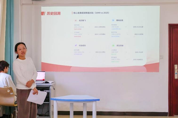 微党课开篇,党支部书记洪思玮从GDP增长、科技突破、民生改善各方面以“一组组跨越时空的数据”为切入点,带领党员们回顾76年发展成就。“数据是国家奋斗的见证,更是我们信心的源泉。”支部党员李瑞萌说。