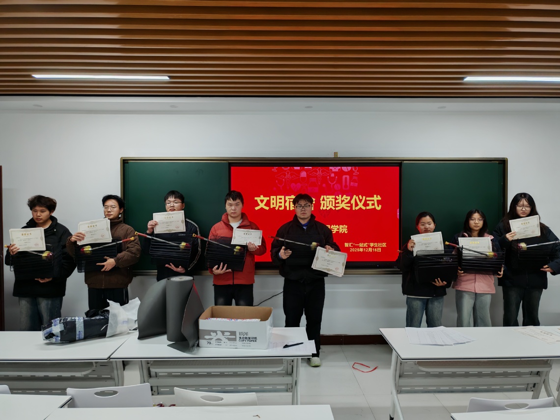学院通过明确奖惩机制激发学生参与热情,12月16日下午,在智汇“一站式”学生社区明德讲堂为优秀宿舍授予“文明宿舍流动红旗”、颁发奖品,并将红旗悬挂在宿舍门口展示以作示范;对卫生差、不合规宿舍,予以通报批评并责令限期整改,后续还将重点复查整改效果,推动问题切实解决。