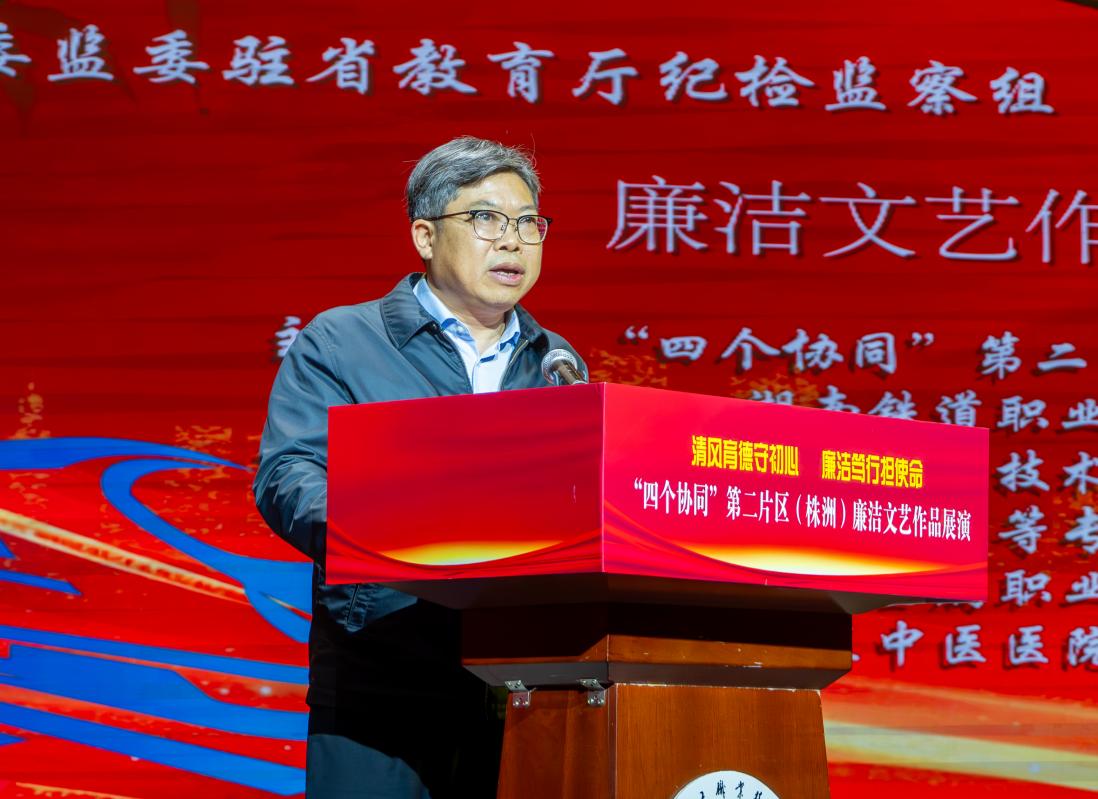 当晚,“四个协同”第二片区(株洲)廉洁文艺展演活动在学校大礼堂拉开序幕。曾市南发表致辞。他表示,落实习近平总书记“五个进一步到位”要求,高校党组织要扛牢主体责任,干部要履责示范,教师要守师德红线。要将清廉文化融入教育与校园文化,借“四个一批”活动促长效,为职教赋能。