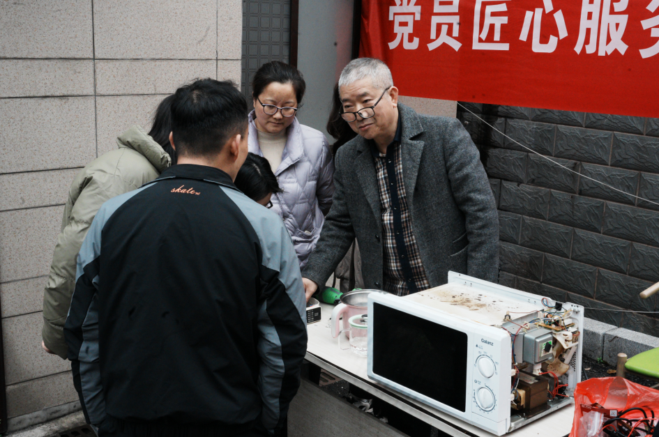 匠心服务,专业技能点亮社区。教工党支部带领“智控先锋”分队在石宋社区搭建维修服务台,开展“党员匠心服务社区,专业技能点亮生活”主题活动。电饭煲、热水壶、台灯……居民们纷纷拿来“罢工”的小家电。志愿者们运用专业知识排查故障、耐心维修还为行动不便的高龄老人上门服务。居民们纷纷点赞:“志愿者技术好,态度好,服务到位!”