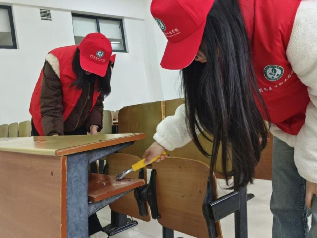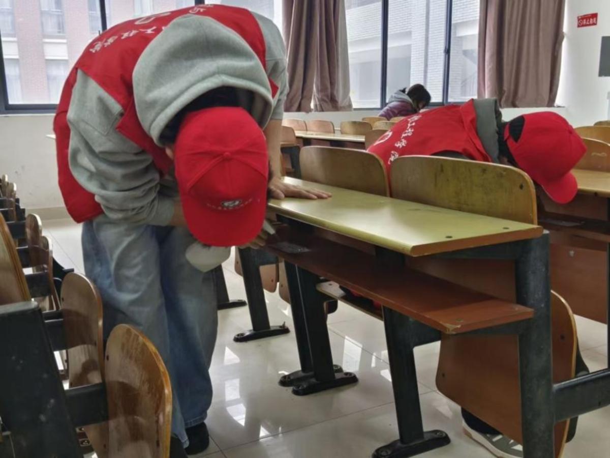 活动现场,志愿者们身着统一志愿服装带着清洁工具,走进厚德楼各间教室,对教室内桌椅、讲台、宣传栏等区域的违规广告、污渍、白色垃圾进行了全面清理。面对顽固难除的胶印和污渍,志愿者们先用除胶剂浸润软化,再用铲子细心铲除,最后用抹布反复擦拭干净。大家齐心协力、辛勤付出,教室环境得到了显著改善。