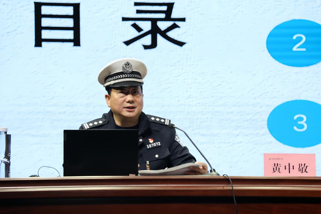 黄中敬围绕交通安全,从国家省市总体交通概况,一盔一带、安全出行,一般性交通事故责任区分,酒醉驾的危害,安全出行需要把握的重要事项五个方面,用详实的案例、专业的知识和丰富的经验,对校园内外潜在的交通安全威胁进行详细讲解,倡导师生共同筑牢交通安全防线。