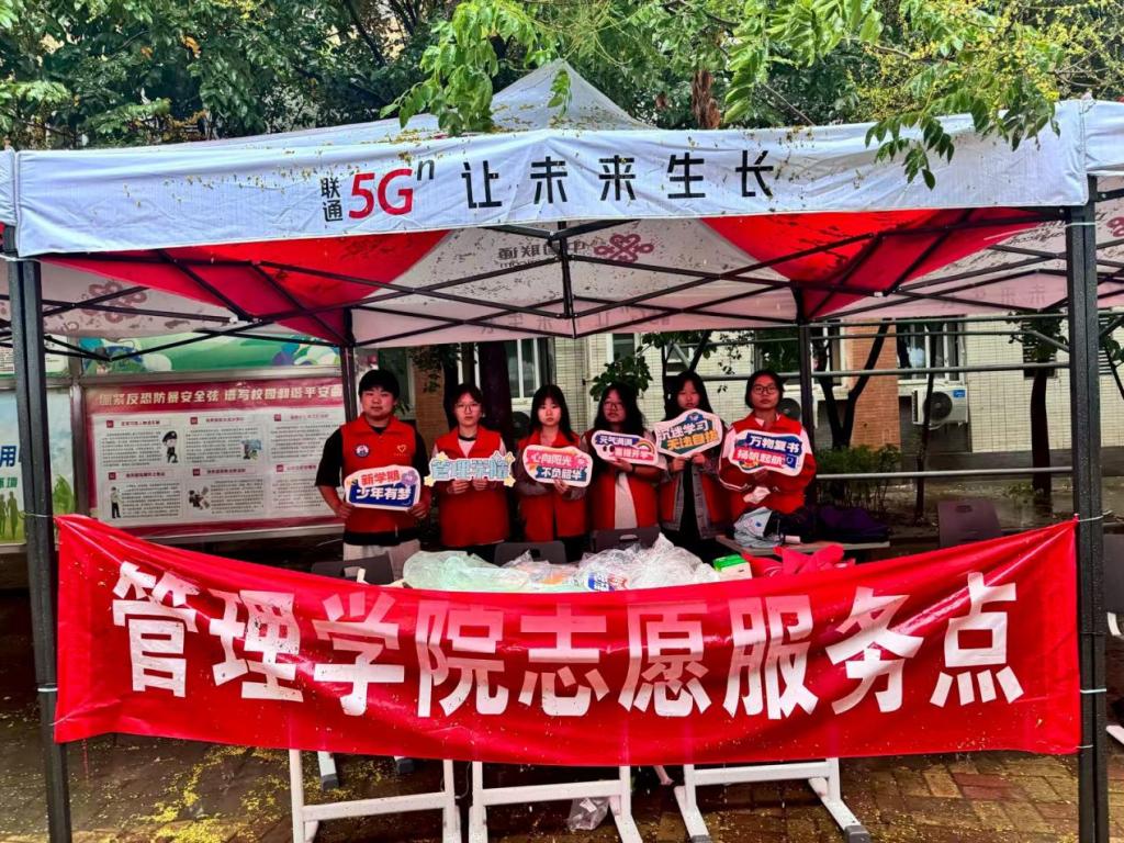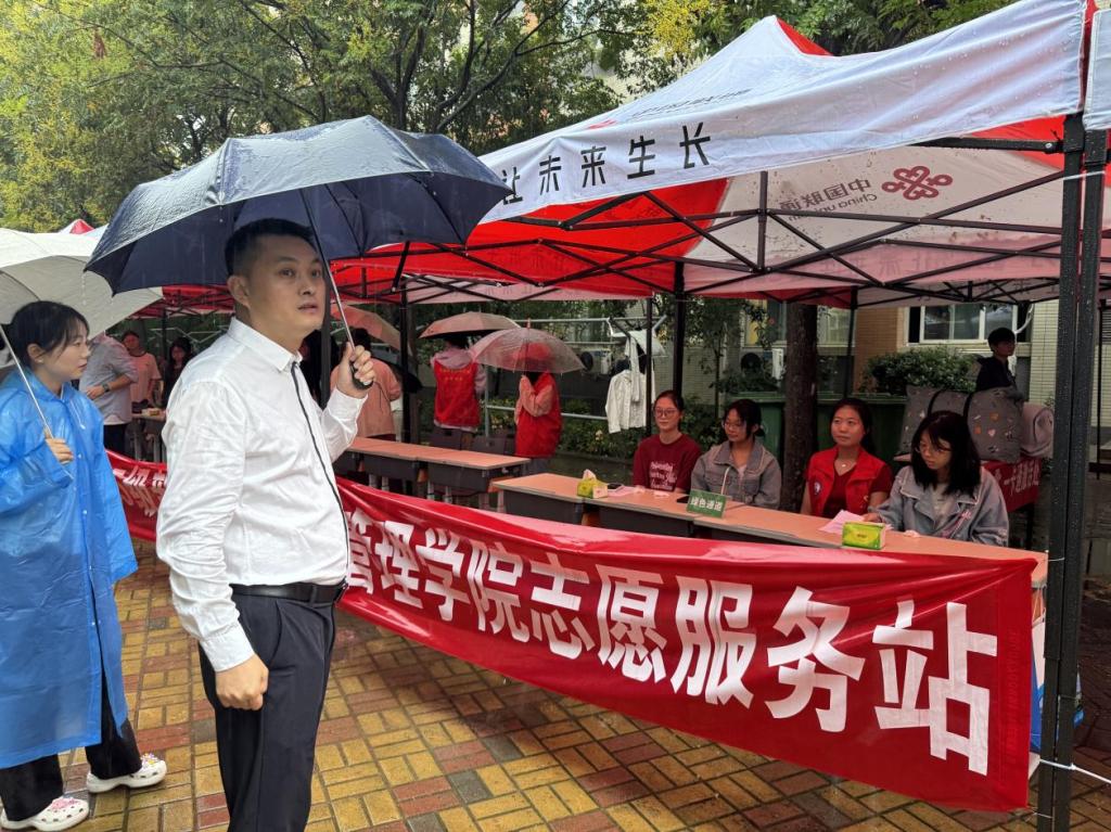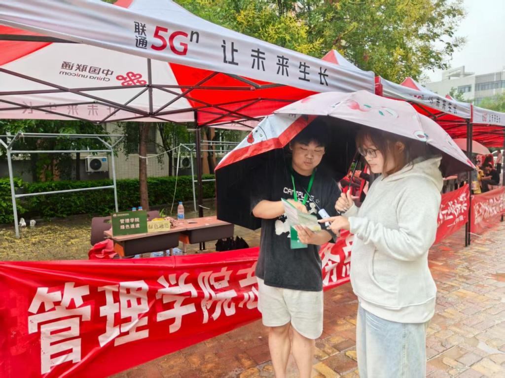 尽管天降大雨,管理学院全体迎新志愿者们依然以高度的责任感和使命感坚守各自岗位,始终保持饱满昂扬的服务热情。他们身着统一标识的服装,有序值守于宿舍楼前、路口引导点等各服务点位,形成了一条高效而温暖的服务链。同时在各接待处,特别专设了“绿色通道”服务窗口,为家庭经济困难学生提供从咨询到申请的一站式帮扶。志愿者们在服务中细致全面地向有需要的学生介绍国家助学贷款、助学金申请等相关内容,切实保障家庭经济困难学生无忧入学。志愿者们用真诚与行动传递着学校的温度,成为迎新现场最温暖、最亮丽的一道风景。