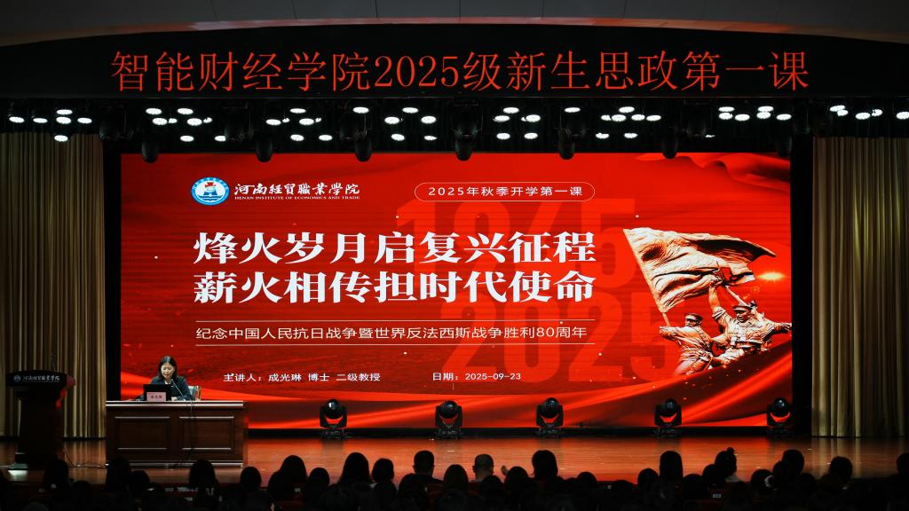 9月23日下午,河南经贸职业学院校长成光琳在1406报告厅为智能财经学院学生讲授了以“烽火岁月启复兴征程,薪火相传担时代使命”为主题的秋季开学“思政第一课”。时值中国人民抗日战争胜利80周年,成光琳以抗战历史为精神纽带,引导青年学子在回望历史中坚定理想,在感悟精神中勇担使命。
