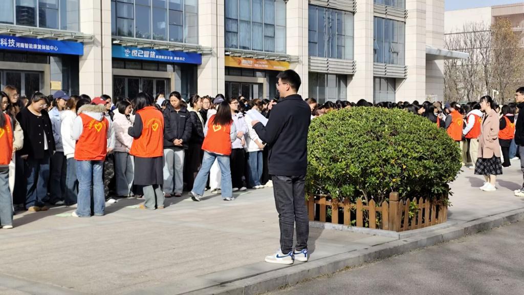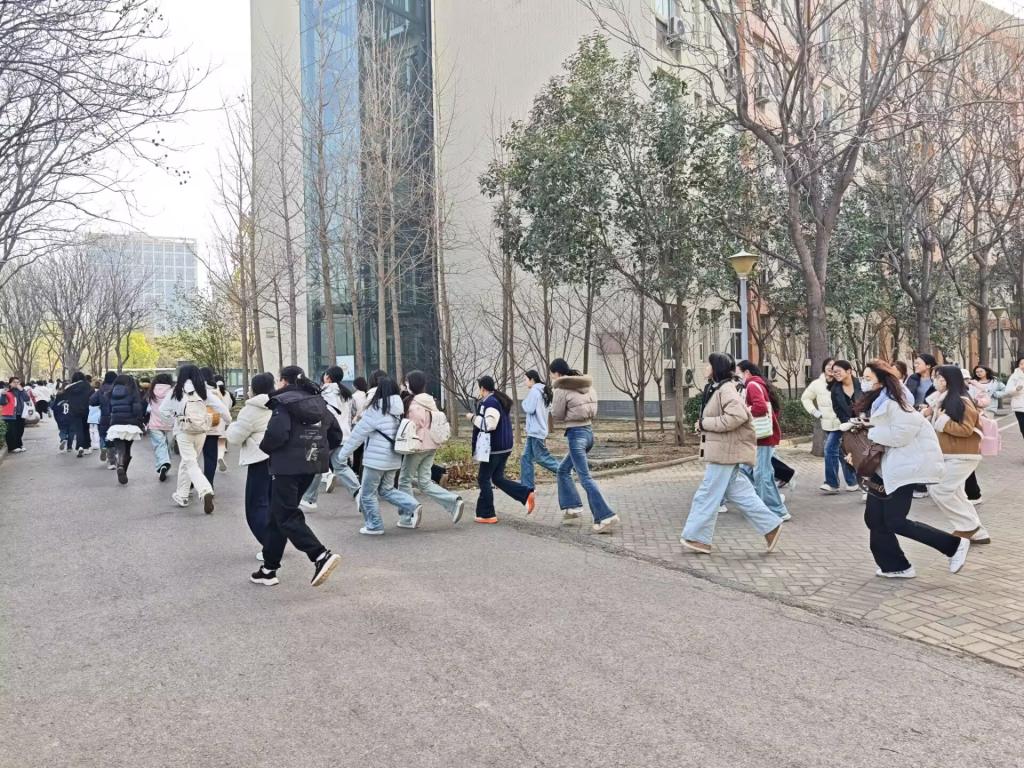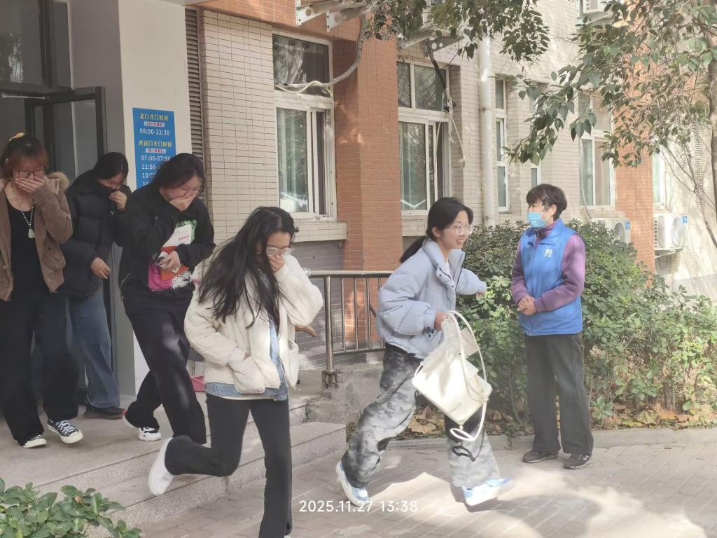 警报声响起,演练正式启动。各楼层负责教师和志愿者立即就位,引导学生捂住口鼻、低姿弯腰,按预定路线迅速有序撤离。在公寓1至6层的楼梯口、楼外通道及综合楼南广场集合点等关键位置,安保处、学工部教师及学生志愿者协同引导,整个疏散过程组织严密、衔接顺畅,展现了良好的应急响应能力。