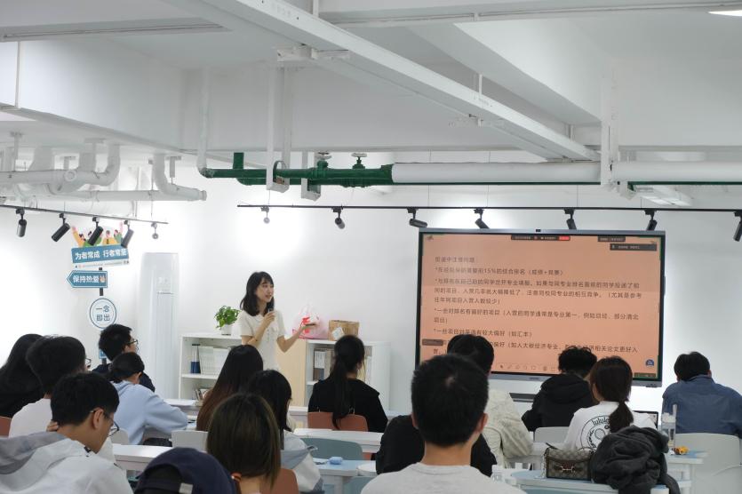 本次分享会邀请了经济与金融学院2021级本科生咸润美同学、江君璇同学担任主讲人。两人分别保研至上海交通大学安泰经济与管理学院和复旦大学经济学院。她们围绕保研流程介绍、保研项目投递准备以及笔面试准备经验等方面,向同学们分享学业规划以及保研的经验和体会等内容。活动中咸润美同学向大家详细介绍了保研所需材料,帮助大三保研关键期的同学梳理填报方法,以及如何应对笔试面试以及备考技巧。江君璇同学从保研流程入手,向同学们介绍了如何进行保研项目的投递准备,结合其自身学习经验给予同学们合理建议。分享会内容丰富有趣、干货满满,获得了与会同学的广泛认可和回应。