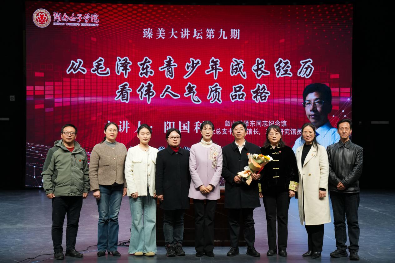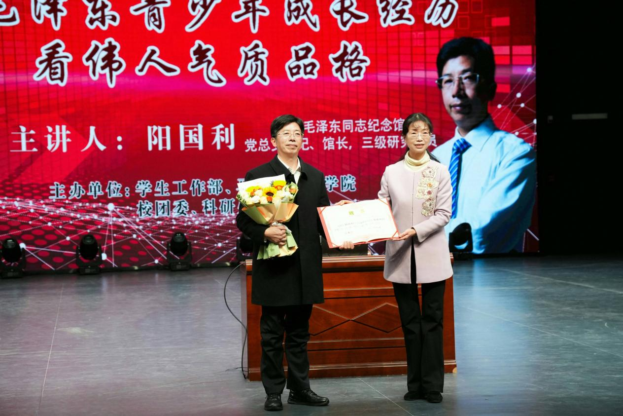 本网讯(学工部 刘晨)2025年3月18日下午,我校第九期“臻美大讲坛”在求实楼骄杨剧场举行,韶山毛泽东同志纪念馆党总支书记、馆长阳国利应邀来校做“从毛泽东青少年成长经历看伟人气质品格”主题讲座。党委副书记、校长何旭娟出席并为主讲嘉宾颁发“客座教授”聘书。学生工作部、马克思主义学院、科研处等相关职能部门负责人、各二级学院党委(党总支)副书记、全体辅导员、学生代表共700余人现场聆听报告。讲座由党委委员、副校长周艳红主持。