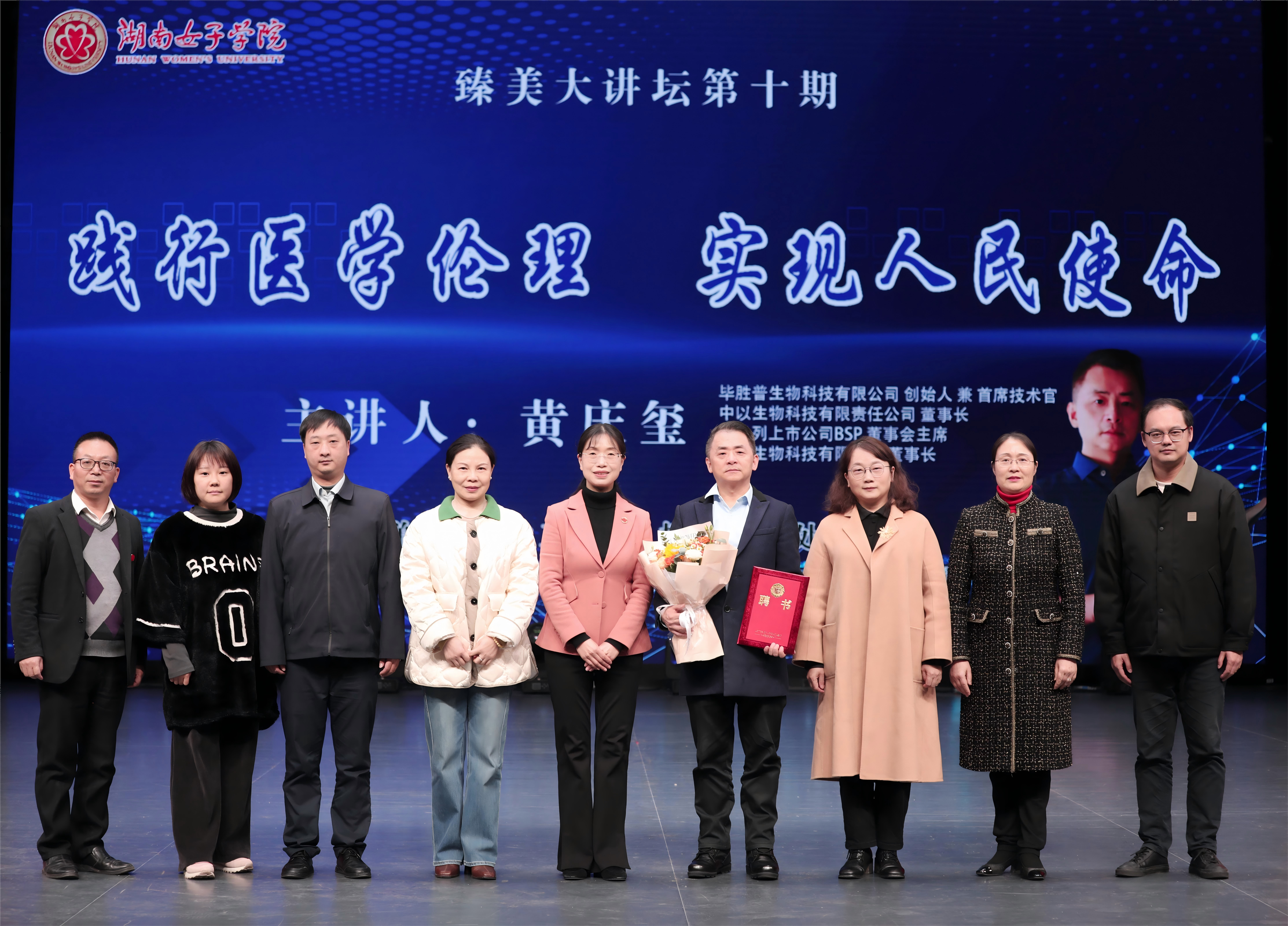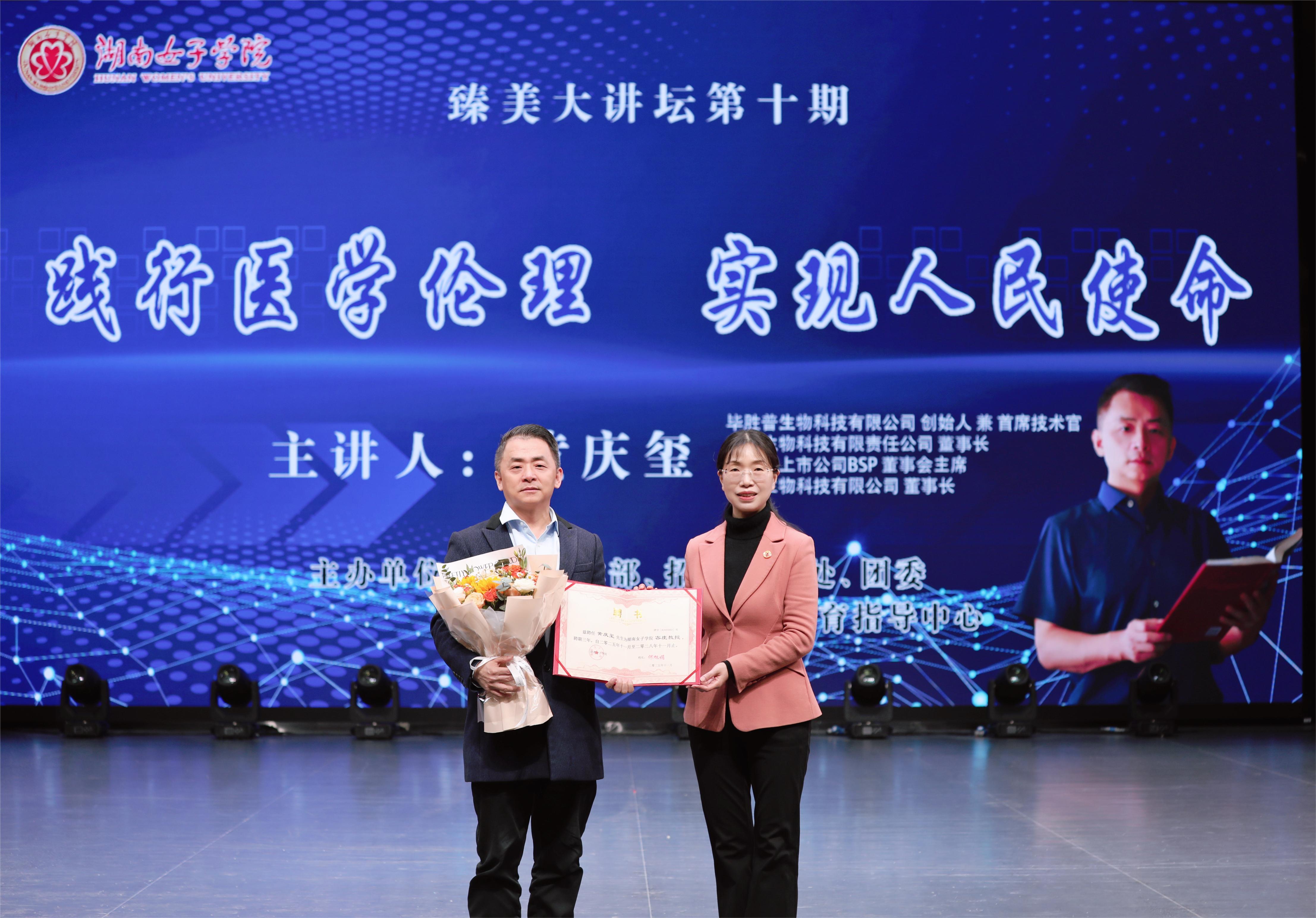 本网讯(学工部 朱晟 刘阳)11月18日下午,我校第十期“臻美大讲坛”在求实楼骄杨剧场举行,中国生物科技领域优秀企业家黄庆玺应邀来校作“践行医学伦理,实现人民使命”主题讲座。党委副书记、校长何旭娟出席并为黄庆玺颁发“客座教授”聘书。学生工作部、招生就业处、产教融合与创新创业教育指导中心、团委等相关职能部门负责人、各二级学院党委(党总支)副书记、全体辅导员及学生代表共800余人现场聆听报告。讲座由党委委员、副校长周艳红主持。