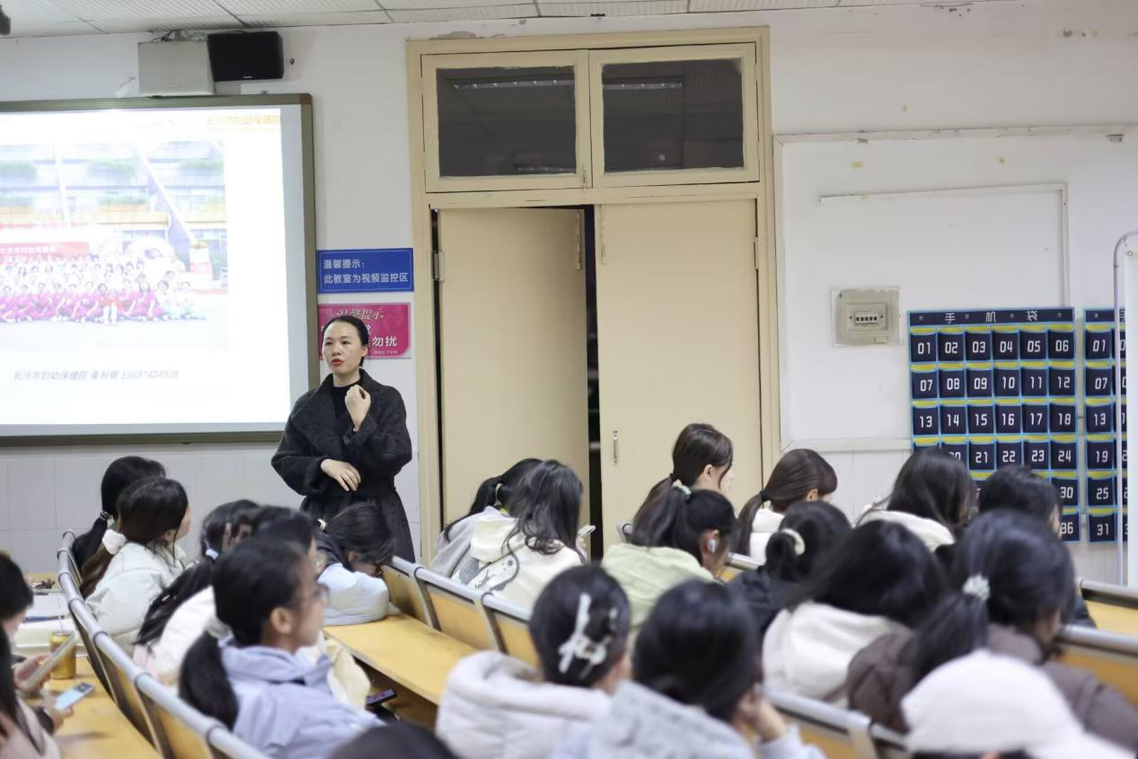 开幕式同步开展了“关爱健康,守护成长”大学生健康讲座。学校特别邀请长沙市妇幼保健院产科一部主任黄利辉教授担任主讲嘉宾。讲座中,黄利辉围绕大学生生理健康防护、艾滋病防治、科学作息与饮食管理等方面,结合临床典型案例,用通俗易懂的语言讲解专业知识;同时针对学生关心的 “学业压力下的情绪调节”“常见健康误区规避”等问题,给出实用建议,引导学子树立“健康第一” 的生活理念。互动环节中,学生们踊跃举手提问,黄利辉耐心细致的解答,赢得现场阵阵好评。