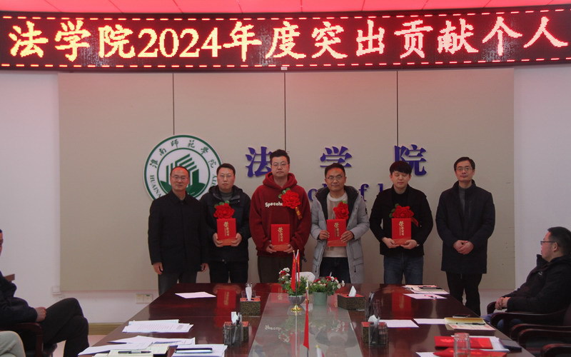 2025年3月6日,法学院在文科楼1311召开2024年事业发展表彰大会暨2025年事业发展任务推进会,法学院党政领导李伟、夏维奇、杨敏、王鹏、项婷婷出席大会。
