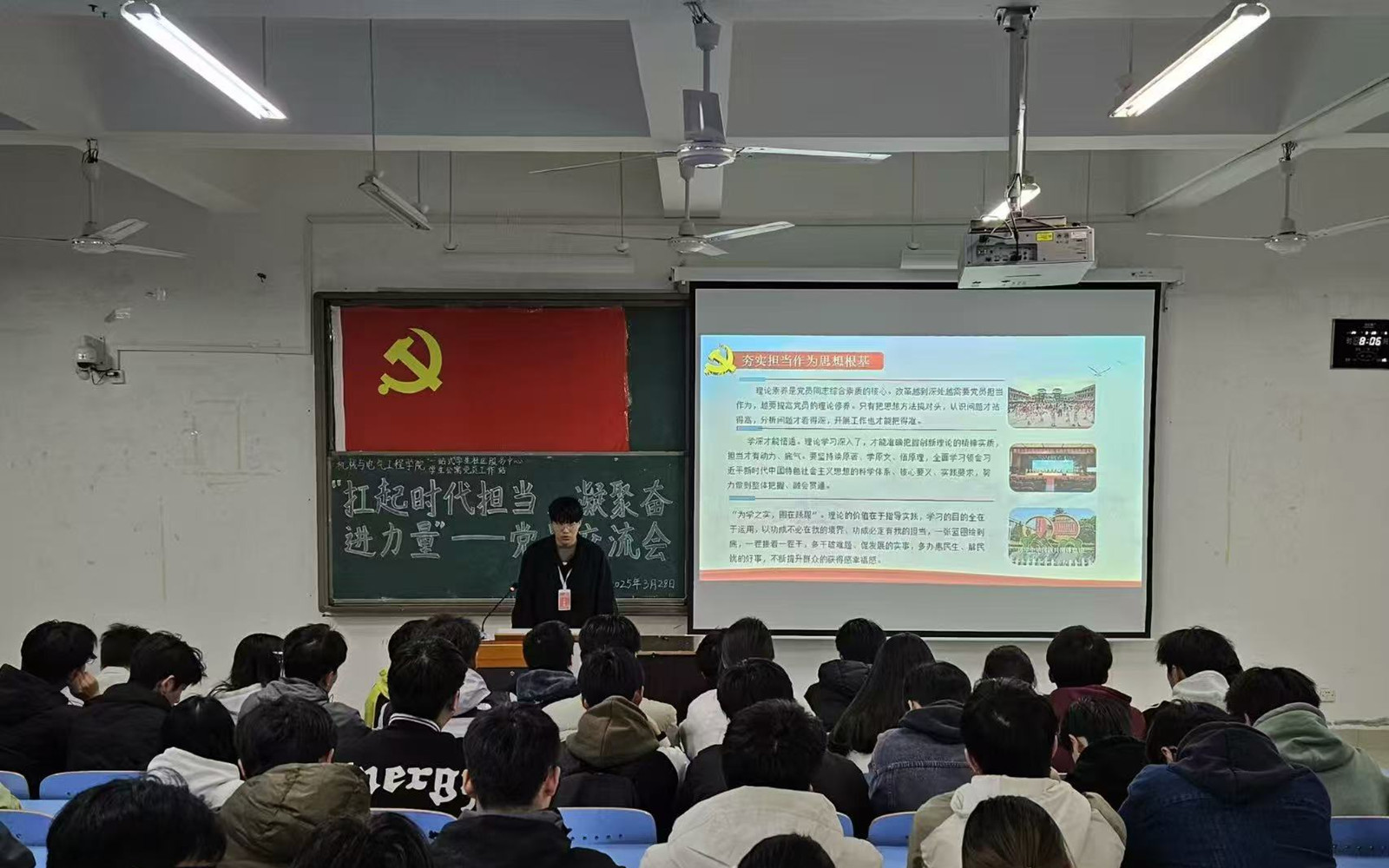 为深入学习贯彻党的二十届三中全会精神,强化党员与入党积极分子的责任感、使命感,3月28日晚20:00,机械与电气工程学院学生公寓党员工作站在泉教D507教室开展了“扛起时代担当,凝聚奋进力量”党员交流会,活动由思政部副部长胡军主持,机械与电气工程学院党站站务委员会成员、入党积极分子、党员以及各部室部长和部员参加。